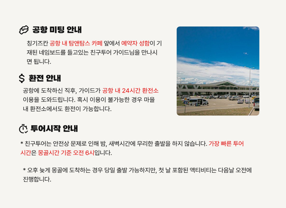 칭기즈칸 국제공항 내 탐앤탐스에서 예약자 성함 보드를 들고있는 가이드님을 만나주세요.