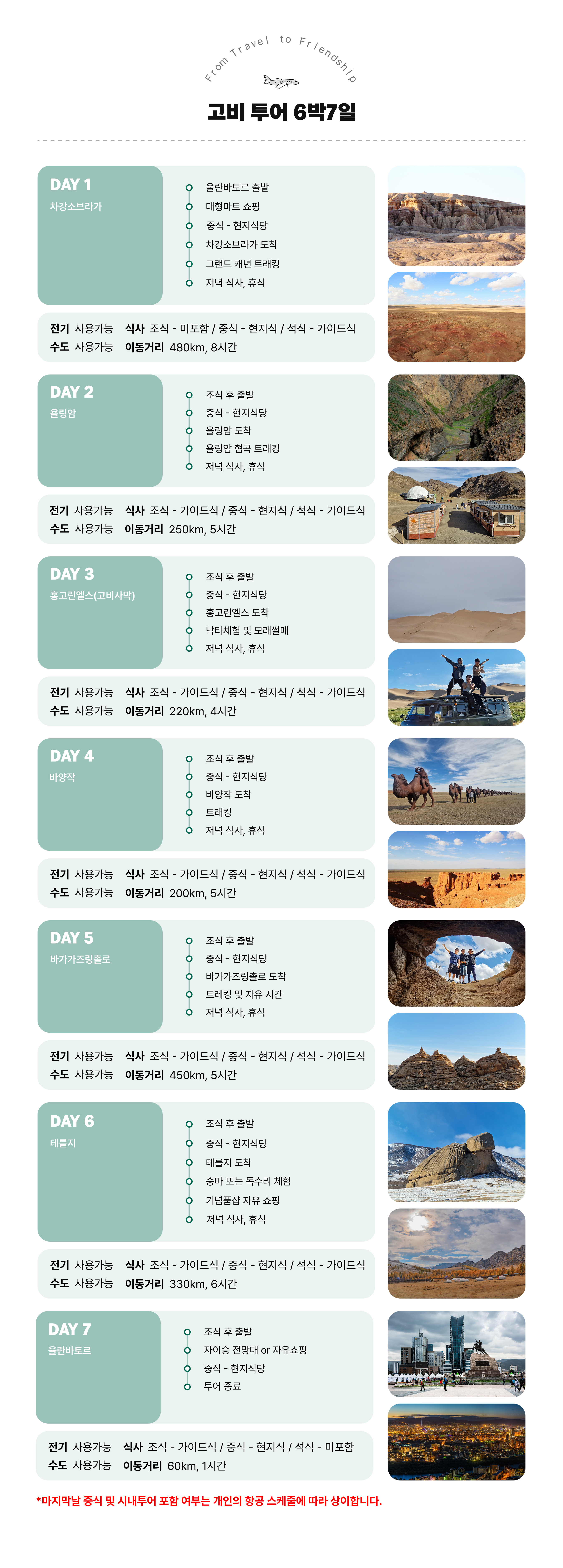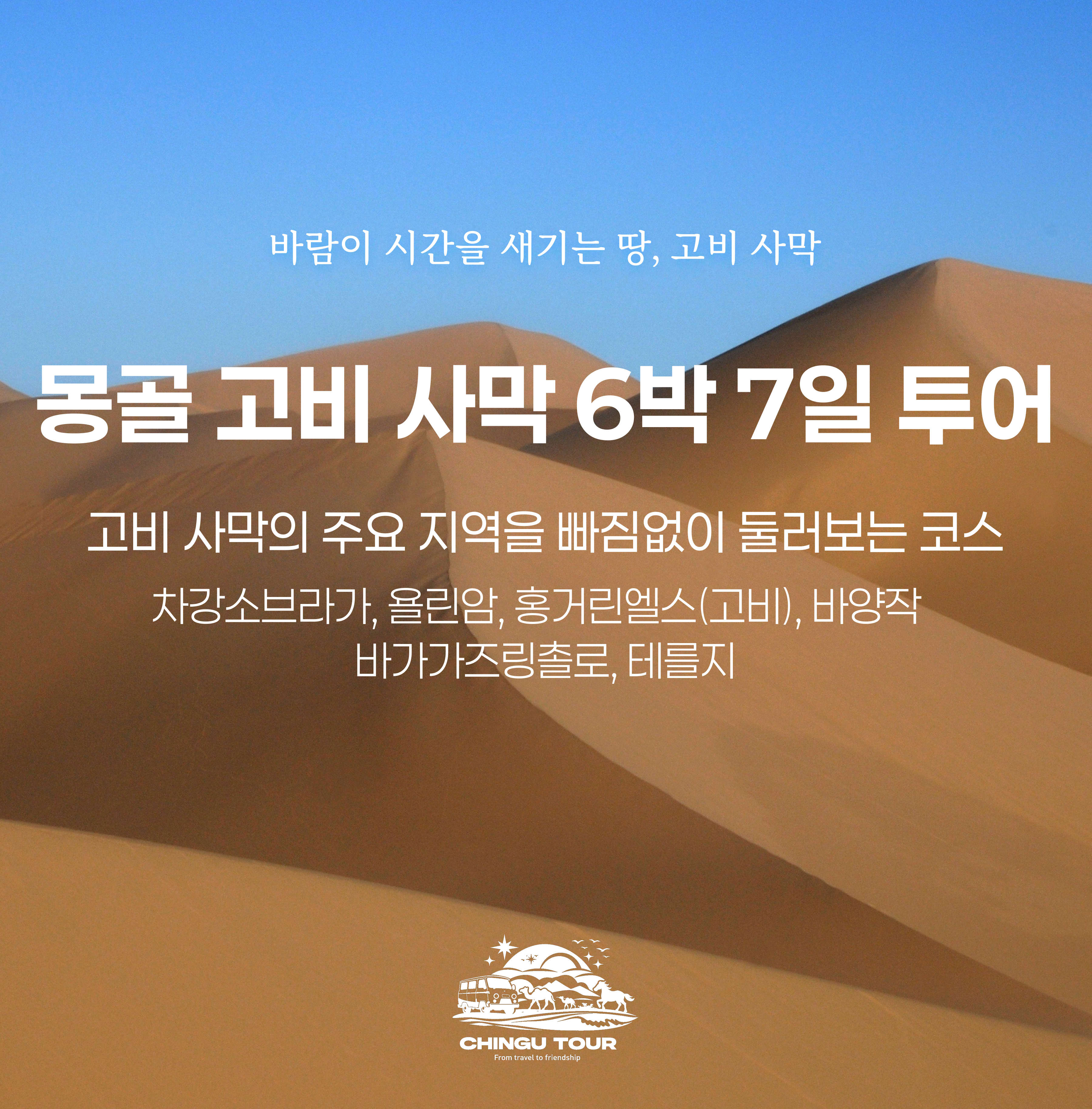 한국어 제공몽골 남부 고비 지역의 대표 명소들을 6박 7일 동안 깊이 있게 탐방하는 사막투어를 소개해요.