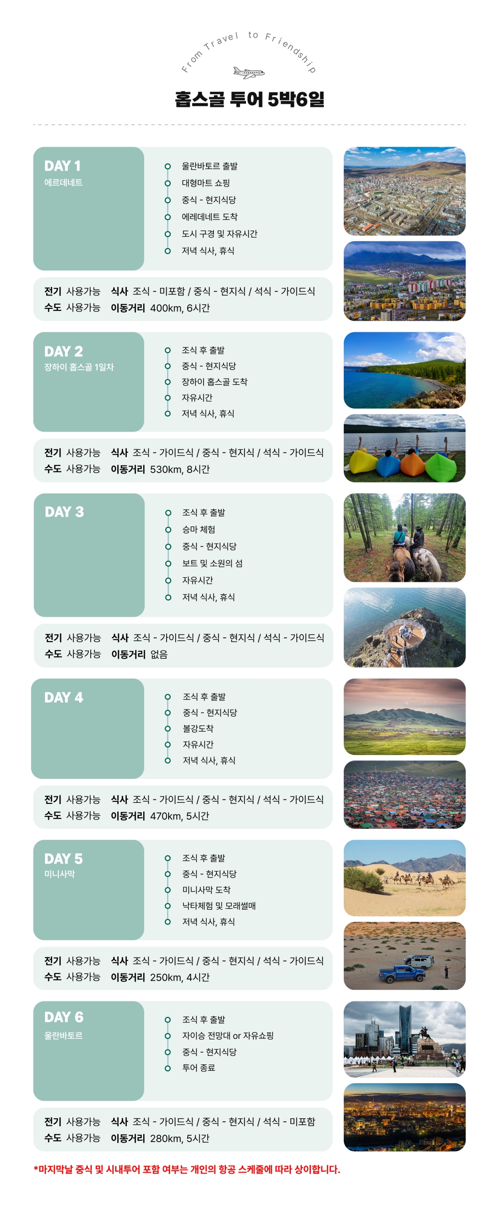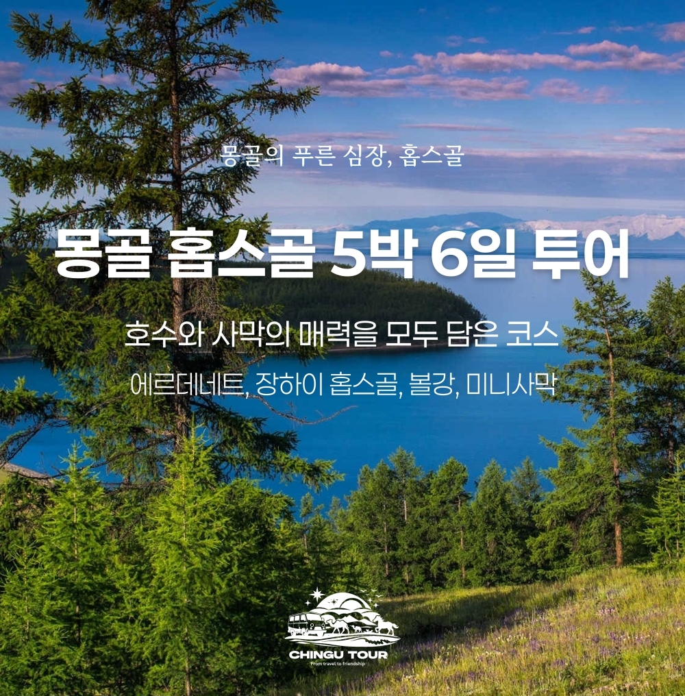 이 여정은 몽골의 사뭇 다른 풍경을 만나보실 수 있어요. 울란바토르에서 홉스골로 향하는 길목에 위치한 에르데네트는 몽골의 2위 도시로, 한적하면서도 정돈된 분위기를 느낄 수 있는 곳이에요. 이어지는 장하이 지역에서는 상업화되지 않은 조용한 자연 속에서 홉스골 호수와 가까이 맞닿은 풍경을 만나볼 수 있어요. ‘몽골의 바이칼’이라 불리는 홉스골 호수에서는 맑고 청정한 자연과 함께 몽골 북부의 대표적인 풍경을 감상할 수 있어요. 여정의 끝에서 몽골의 조용한 작은 마을 볼강의 풍경을 지나 몽골의 대표 관광지 미니사막까지 만나보실 거예요. 많은 여행자들의 버킷리스트로 꼽히는 홉스골의 자연 속에서 특별한 시간을 보내실 수 있도록 안내해 드릴게요.