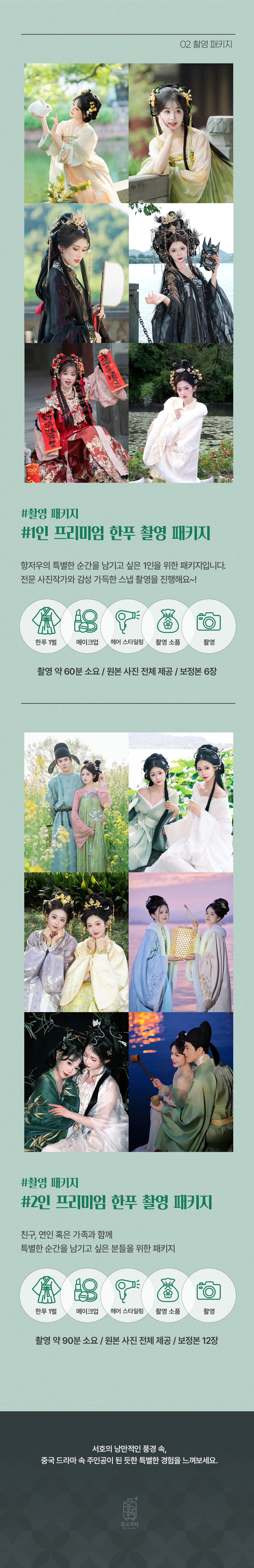 서호 주변은 도보 이동만으로도 다양한 포토 스팟을 만날 수 있어 촬영 이후에도 의상을 입은 채 자유롭게 여행을 이어갈 수 있어요. 관광과 체험이 분리되지 않고 하나로 이어지기 때문에 시간 활용도가 높고, 여행 동선 효율까지 고려된 상품이에요. 한푸와 치파오 각각의 분위기가 달라 취향에 따라 전혀 다른 결과물을 얻을 수 있다는 점도 특징이에요. 한푸는 전통적이고 우아한 분위기를, 치파오는 도시적이고 세련된 분위기를 연출할 수 있어 동행자와 다른 스타일로 촬영하면 더욱 다양한 결과를 남길 수 있어요. 여행 중 하루를 특별하게 만들고 싶거나, 단순한 관광을 넘어 ‘기억에 남는 콘텐츠’를 만들고 싶은 분들에게 적합한 체험을 찾는 분들께 추천해요.