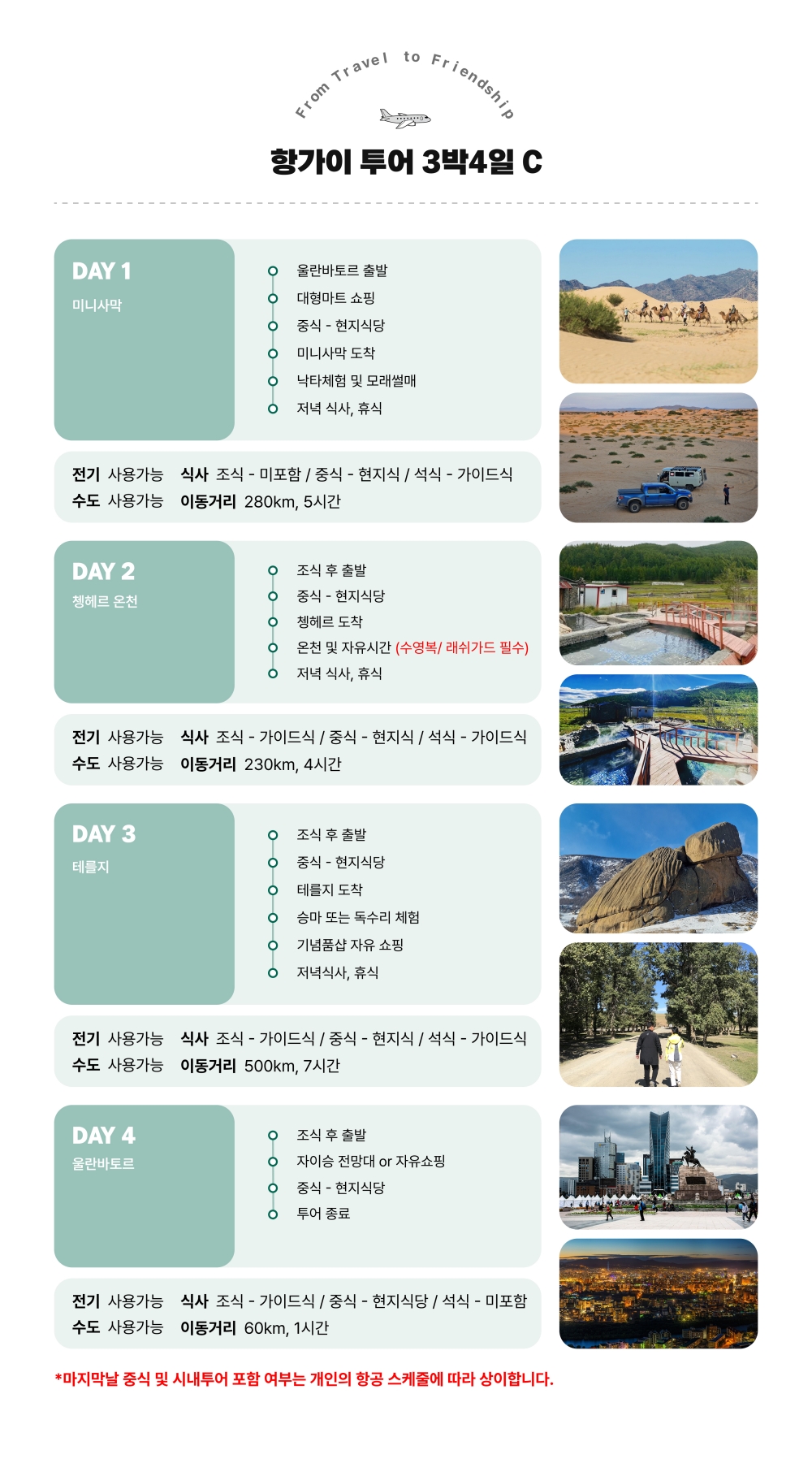 3박4일 C 코스는 몽골의 대표적인 풍경을 알차게 둘러보는 일정이에요. 사막 풍경을 가까이에서 경험할 수 있는 미니사막에서 낙타체험과 모래썰매 등을 즐긴 뒤, 몽골 중부의 쳉헤르 온천에서 자연 온천욕을 하며 휴식을 취할 수 있어요. 이어 울란바토르 인근의 테를지 국립공원에서는 초원과 기암 바위 풍경을 감상하며 몽골 여행에서 많이 찾는 대표 명소를 함께 둘러볼 수 있어요.