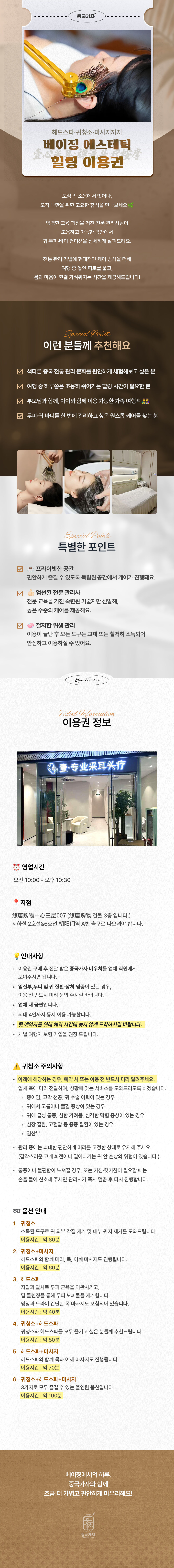 취소불가도심 속 소음에서 벗어나, 오직 나만을 위한 고요한 휴식을 만나보세요. 엄격한 교육 과정을 거친 전문 관리사님이 조용하고 아늑한 공간에서 귀와 두피, 바디 컨디션을 섬세하게 살펴드려요. 전통 관리 기법에 현대적인 케어 방식을 더해 여행 중 쌓인 피로를 풀고, 몸과 마음이 가벼워지는 시간을 제공해드립니다!