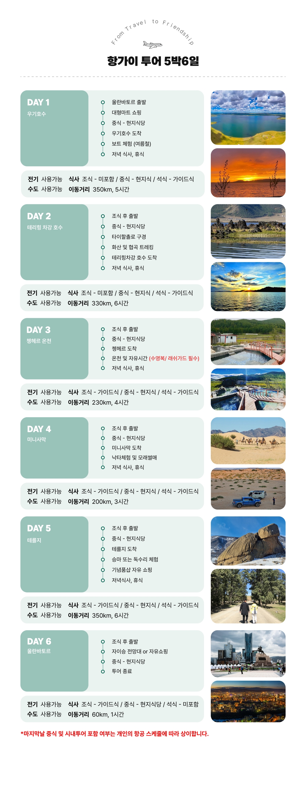몽골 북부에 위치한 우기 호수에서는 초원과 호수가 어우러진 풍경을 따라 산책하며 여유로운 시간을 보낼 수 있어요. 이어 테리힝차강 호수에서는 더욱 광활한 자연 속에서 몽골만이 가진 고요한 분위기를 느껴볼 수 있어요. 쳉헤르 온천에 도착하여 푸른 자연 속에서 온천욕을 통해 여행의 피로를 풀 수 있어요. 이후 미니사막에서 낙타체험과 모래썰매 등 사막 액티비티를 즐기며 또 다른 풍경을 경험할 수 있어요. 마지막으로 테를지 국립공원의 푸른 초원과 기암 바위 풍경을 감상하며 여정을 마무리할 수 있어요.