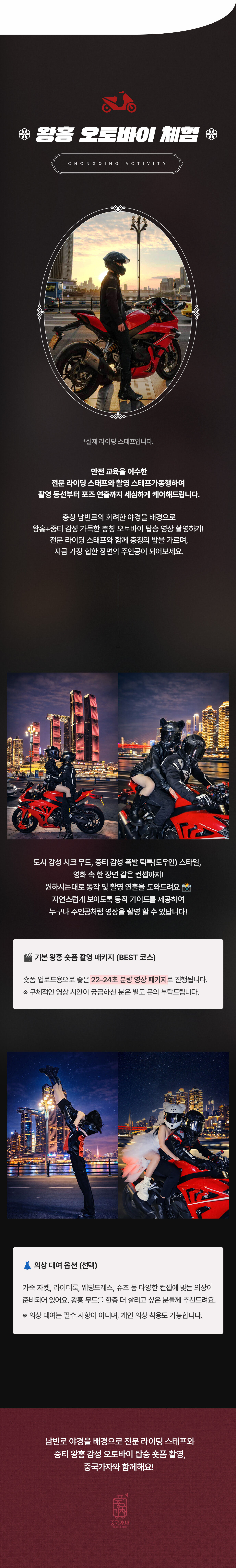 취소불가요즘 SNS에서 가장 핫한 도시 충칭, 도시를 가로지르는 도로 위에서 왕홍 감성 영상의 주인공이 되어보는 특별한 체험이에요. 남빈로 일대의 야경을 배경으로 오토바이에 올라타면, 빠르게 스쳐가는 도시의 불빛과 함께 영화 같은 장면이 자연스럽게 완성돼요. 단순한 체험이 아니라 촬영과 편집까지 포함된 콘텐츠형 액티비티라는 점이 가장 큰 매력이에요. 전문 촬영팀이 동행해 감성적인 연출을 도와주고, 촬영 후에는 숏폼 영상으로 완성되어 여행의 순간을 그대로 간직할 수 있어요