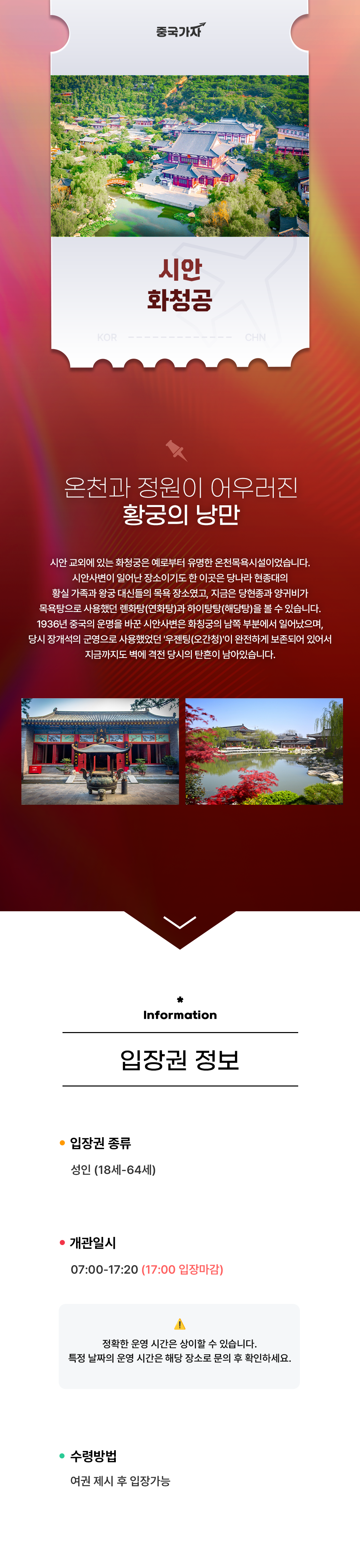 취소가능시안 교외에 위치한 화청궁은 오래전부터 황실이 사랑한 온천 궁전으로, 자연 속에서 휴식과 권위를 동시에 누리던 특별한 공간이었습니다. 당나라 현종 시기에는 황실 가족과 대신들이 머물며 온천을 즐기던 장소로 사용되었고, 지금도 그 흔적이 고스란히 남아 있습니다. 특히 이곳에서는 당현종과 양귀비가 사용했던 것으로 전해지는 연화탕과 해당탕을 직접 볼 수 있어, 역사 속 이야기가 더욱 생생하게 느껴집니다. 고요한 온천 공간을 거닐다 보면 천 년 전 황실의 일상이 눈앞에 펼쳐지는 듯한 기분을 줍니다. 한편 화청궁은 단순한 휴식의 공간을 넘어, 중국 근현대사의 중요한 사건인 시안사변이 일어난 장소이기도 합니다. 1936년, 중국의 흐름을 바꾼 이 사건은 이곳 남쪽 지역에서 발생했으며, 당시 장개석의 군영으로 사용되던 건물은 지금까지도 보존되어 있습니다. 벽에 남아 있는 탄흔은 그날의 긴박했던 순간을 그대로 전해줍니다.