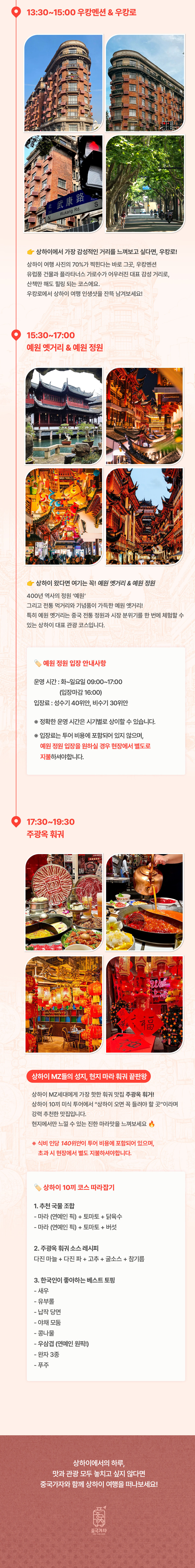 현지 분위기를 그대로 느낄 수 있는 상하이식 아침 식사를 시작으로, 현지인과 여행객 모두가 극찬하는 라오지스 홍소육과 지스 볶음밥, 그리고 얼얼한 매력을 제대로 느낄 수 있는 현지 마라 훠궈 맛집까지 경험할 수 있습니다. 또한 유명 연예인 유튜브 ‘상하이 10끼 코스’ 중 가장 반응이 좋았던 핵심 맛집만 엄선해 구성했어요. MZ세대가 좋아하는 SNS 핫플부터 부모님과 함께 가기 좋은 한국인 입맛 맞춤 맛집까지 모두 만족할 수 있도록 구성했으며, 상하이 필수 관광지까지 더해져 하루가 꽉 차게 채워집니다. 또한 다른 사람과 섞이지 않고 우리 일행만 단독으로 진행되는 프라이빗 투어로 더욱 편안하고 여유롭게 즐길 수 있어요!
