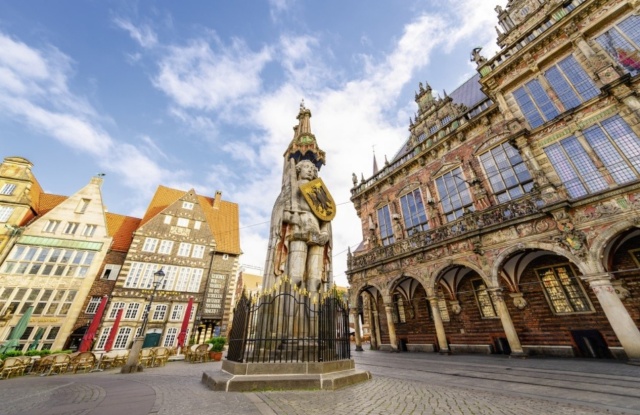600년의 시간을 견뎌온 독일 고딕 양식의 정수, 브레멘 시청사 앞에서 여정을 시작합니다. 도시의 자유를 상징하는 롤란트 상의 당당한 위용과 정교한 베저 르네상스 건축의 디테일을 배경으로, 당신의 모습에 중세의 클래식한 무드를 더해드립니다.