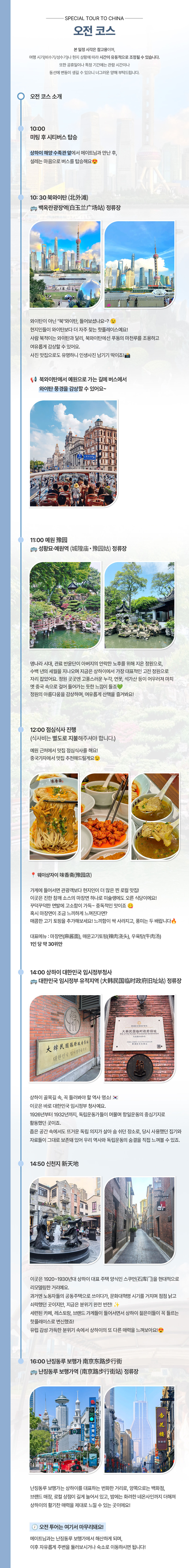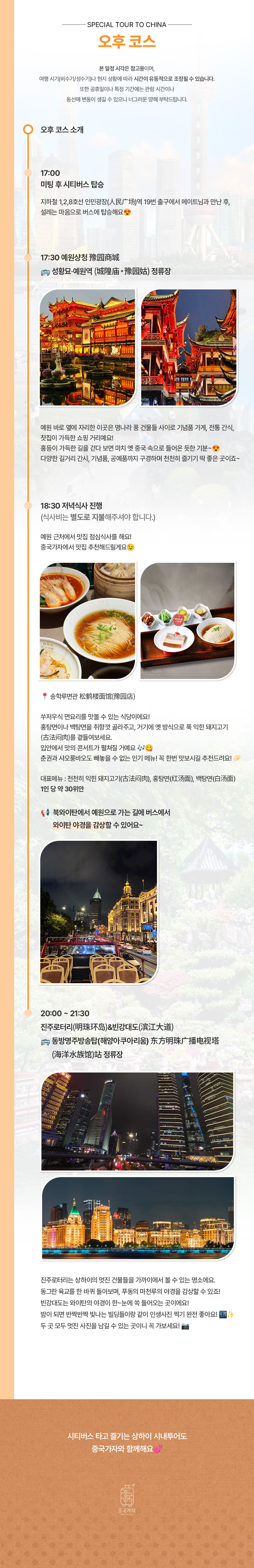 한국어 제공상하이를 처음 방문한다면 복잡한 길 찾기 대신, 시티버스를 타고 편하게 돌아보는 투어를 추천드려요. 테마에 따라 골라 즐기는 구성으로, 꼭 가봐야 할 핵심 명소만 알차게 담았습니다. 오전에는 예원, 대한민국 임시정부, 신천지까지 이어지는 알짜 코스를 여유롭게 둘러보고, 오후에는 예원상청부터 동방명주, 빈강대도까지 반짝이는 야경을 만끽하는 로맨틱 투어가 기다리고 있어요. 도보는 최소로, 이동은 편안하게! 짧은 시간 안에 상하이의 매력을 제대로 담아가는 스마트한 선택, 지금 경험해보세요!