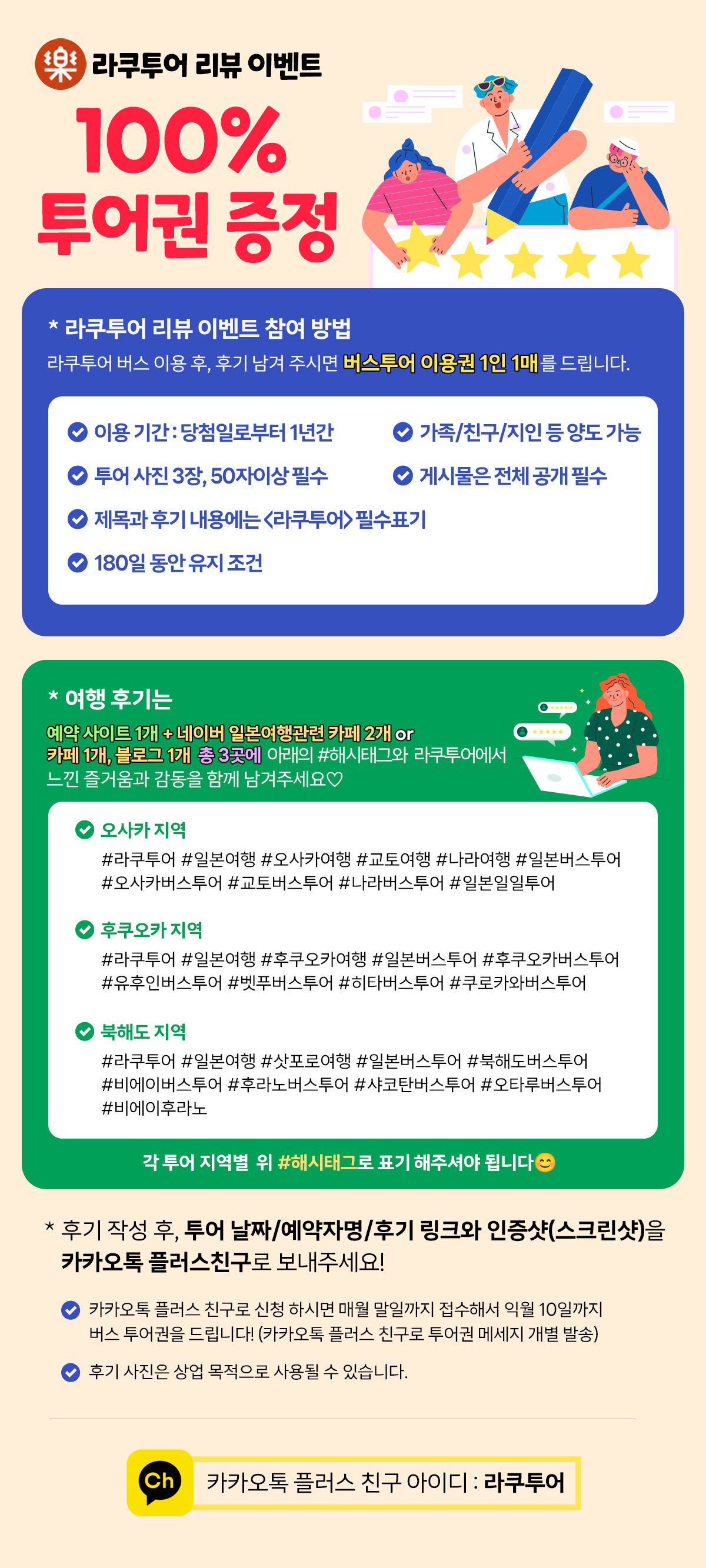 한국어 제공💓본 상품은 인기가 많아서 빠르게 마감되는 상품입니다💓 [전날도 예약 가능할 수 있으니 문의 주세요.] (문의) 카카오톡 플러스 친구 : 라쿠투어 연락주시면 빠르게 답변드리겠습니다. 💓출발 확정 날짜💓 ✔ 2026년 전 날짜 모객중~! * 여행 문의가 계속 들어오고 있으니 최대한 빠른 예약 부탁드립니다! * 빠르게 마감되어 확정이 불가할 수 있으니 참고바랍니다. ✅ 골든위크 기간 안내사항 ✅ 안녕하세요 라쿠투어입니다. 4월 29일(수)부터 5월 6일(수)까지 일본 황금연휴 골든위크 기간입니다. 전체적으로 많은 인파로 도로 정체가 예상됩니다. 현지 상황에 따라 코스 변경, 시간 조정 등 운행에 변경이 있을 수 있으니 예약 시 참고 부탁드립니다. 최대한 편안한 여행을 위해서 노력하겠습니다! 즐거운 여행 되시길 바랍니다. 감사합니다. 상품 구매자 전원에게 일본 빅카메라 7% 할인 쿠폰을 드려요! 쿠폰은 구매내역 페이지에서 다운로드 가능합니다. 상품 구매자 전원에게 일본 돈키호테 최대 15% 할인 쿠폰을 드려요! 쿠폰은 구매내역 페이지에서 다운로드 가능합니다.