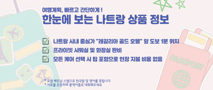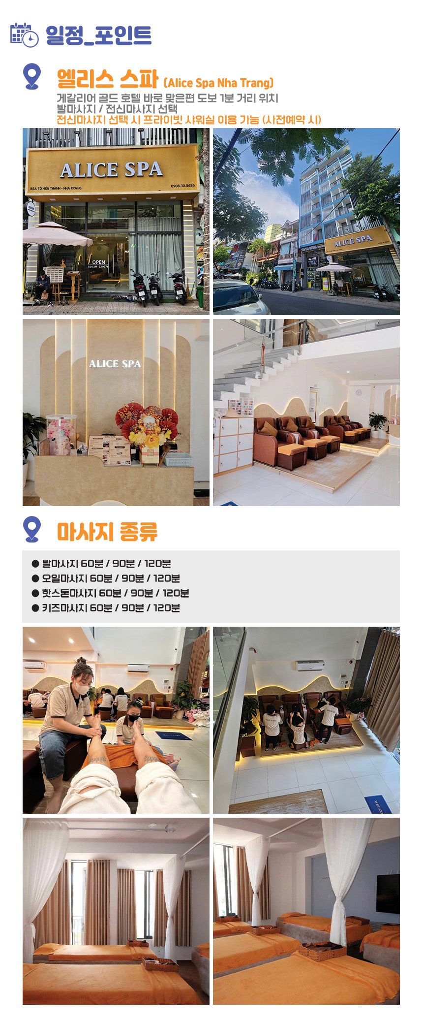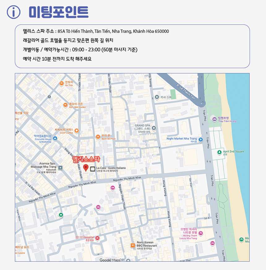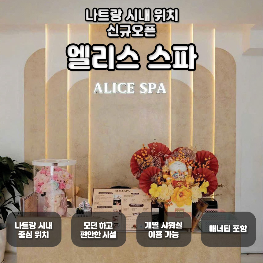 나트랑의 푸른 활기 속에 자리 잡은 평온한 안식처, '엘리스 스파'를 소개합니다. 나트랑 시내의 중심, 레갈리아 골드 호텔 바로 맞은편에 위치한 이곳은 여행의 설렘 뒤에 찾아오는 기분 좋은 노른함을 완벽한 휴식으로 바꾸어주는 공간입니다. 도보 1분 거리의 뛰어난 접근성은 물론, 모던하고 깔끔한 인테리어가 발을 들이는 순간부터 마음을 차분하게 진정시켜 줍니다. 소중한 사람과 함께, 혹은 나만을 위한 온전한 충전의 시간을 엘리스 스파에서 경험해 보세요.