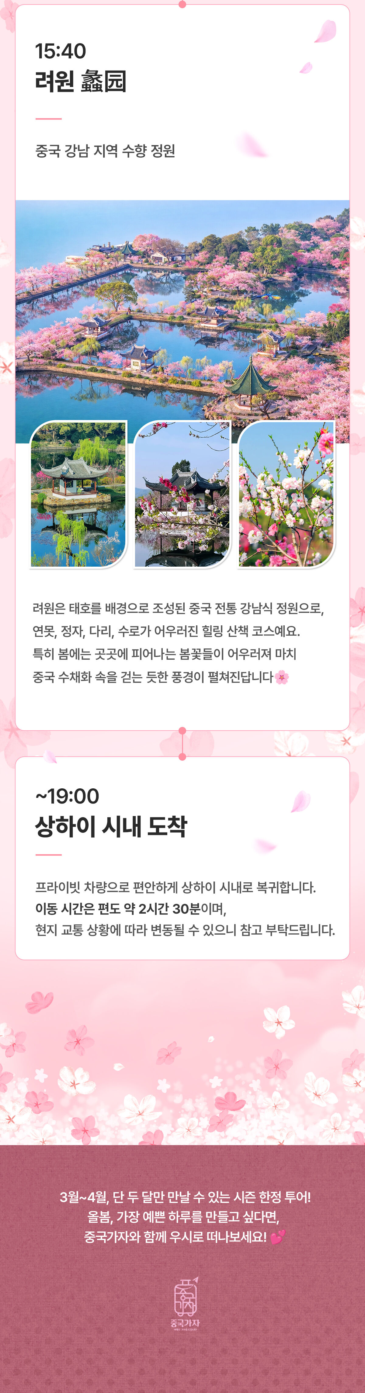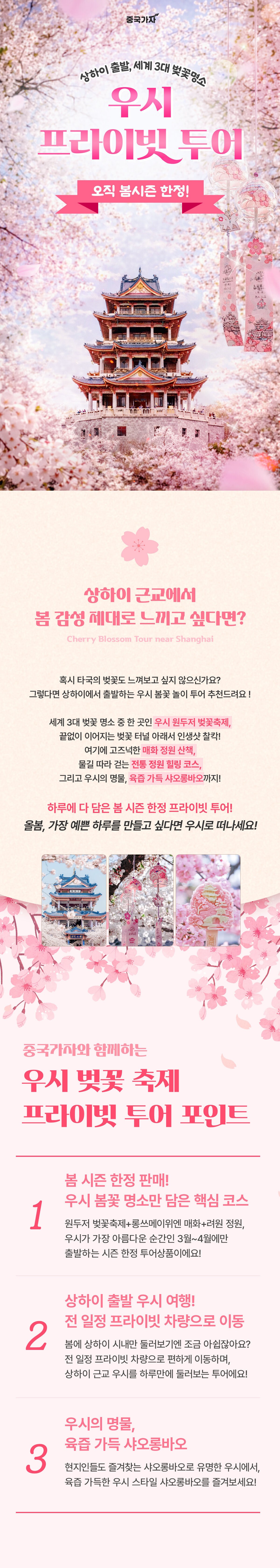 한국어 제공올봄, 한국이 아닌 색다른 벚꽃을 만나보고 싶다면 지금이 기회예요. 상하이에서 출발해 만날 수 있는 우시 원두저 는 세계 3대 벚꽃 명소로 손꼽히는 곳으로, 끝없이 이어지는 벚꽃 터널 아래에서 걷는 순간 그야말로 영화 같은 풍경이 펼쳐집니다. 만개한 벚꽃 사이에서 인생샷을 남기고, 이어서 롱쓰메이위엔 의 고즈넉한 매화 정원을 산책하며 봄의 향기를 온전히 느껴보세요. 여기에 물길을 따라 이어지는 전통 정원 려원 까지 더해져 자연과 전통이 어우러진 힐링 코스를 완성합니다. 그리고 여행의 즐거움을 더해줄 우시의 명물, 육즙 가득한 샤오롱바오까지 맛볼 수 있어 하루를 풍성하게 채워드려요. 전 일정 프라이빗 차량으로 이동해 긴 동선도 편안하게 즐길 수 있으며, 3월부터 4월까지 가장 아름다운 시즌에만 운영되는 한정 투어로 더욱 특별한 경험을 선사합니다. 올봄 가장 예쁜 하루를 만들고 싶다면, 지금 바로 우시로 떠나보세요.