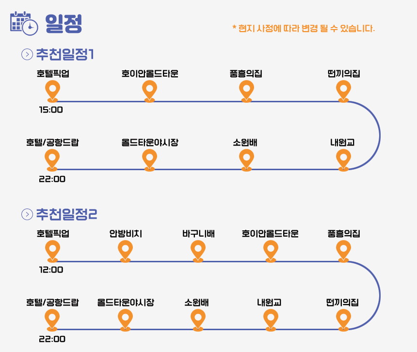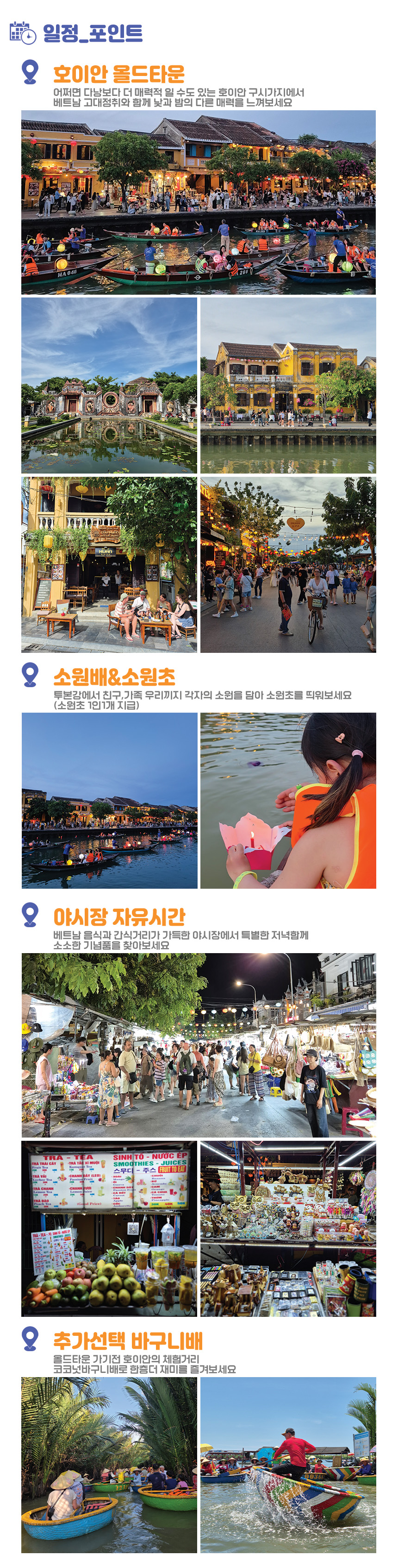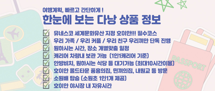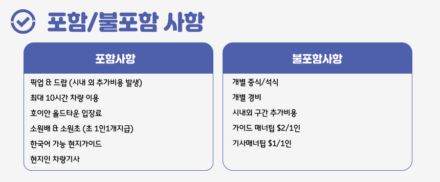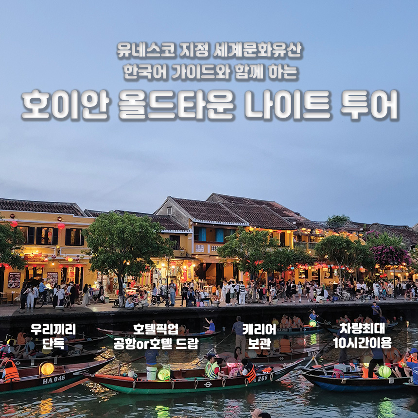 호텔 픽업으로 편안하게 여정을 시작하여 전문가의 설명과 함께 역사적인 고택들을 방문하고, 해가 지면 야시장의 활기와 소원배의 낭만까지 한 번에 경험할 수 있습니다. 안방비치나 바구니배 체험이 포함된 옵션을 선택해 더욱 다채로운 호이안의 얼굴을 마주해보세요.