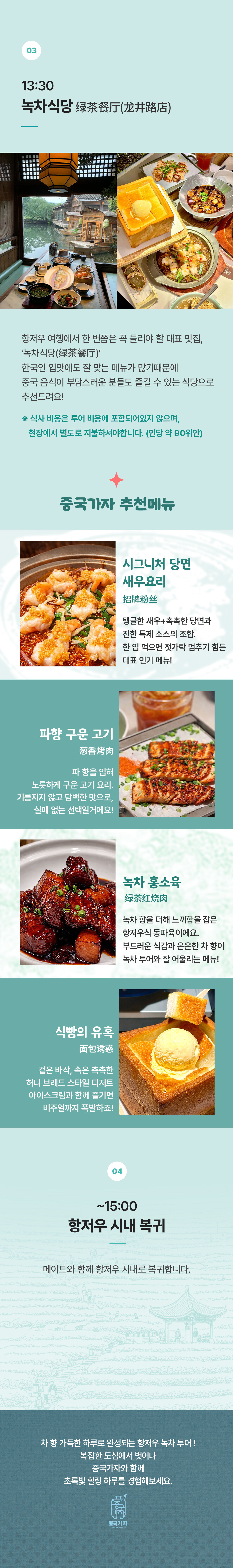 한국어 제공중국 10대 명차로 꼽히는 용정차의 본고장, 항저우 에서 초록빛 힐링을 가득 담은 특별한 하루를 만나보세요. 끝없이 펼쳐진 용정차밭 에서 직접 찻잎을 수확해보는 이색 체험과 함께, 차향 가득한 풍경 속에서 여유로운 티타임을 즐길 수 있어요. 계단식으로 이어진 푸른 차밭을 따라 걷다 보면 어느새 마음까지 편안해지는 진짜 힐링을 느낄 수 있습니다. 여기에 현지인들이 즐겨 찾는 맛집에서 항저우의 미식까지 더해져 하루를 더욱 풍성하게 채워드려요. 초록빛 자연을 배경으로 감성 가득한 인생샷을 남길 수 있는 것은 물론, 전 일정 프라이빗 차량으로 이동해 편안하게 여행할 수 있고, 한국어가 가능한 현지 메이트가 동행해 언어 걱정 없이 체험과 관광을 모두 즐길 수 있습니다. 바쁜 일상에서 벗어나 자연 속에서 여유를 느끼고 싶다면, 항저우 녹차 투어로 가장 싱그러운 하루를 완성해보세요.