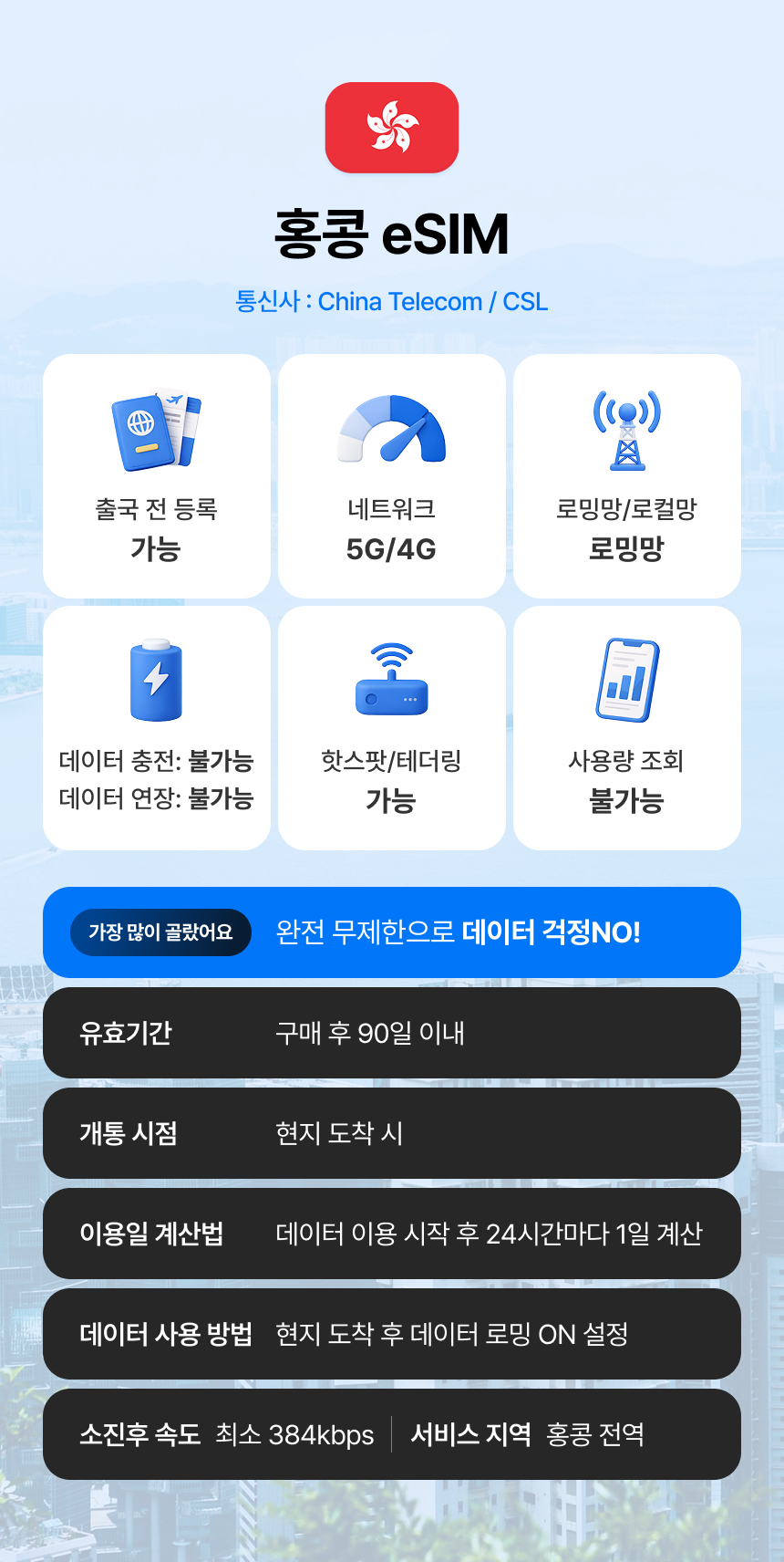 [10%할인] [완전 무제한] 홍콩 eSIM 이심