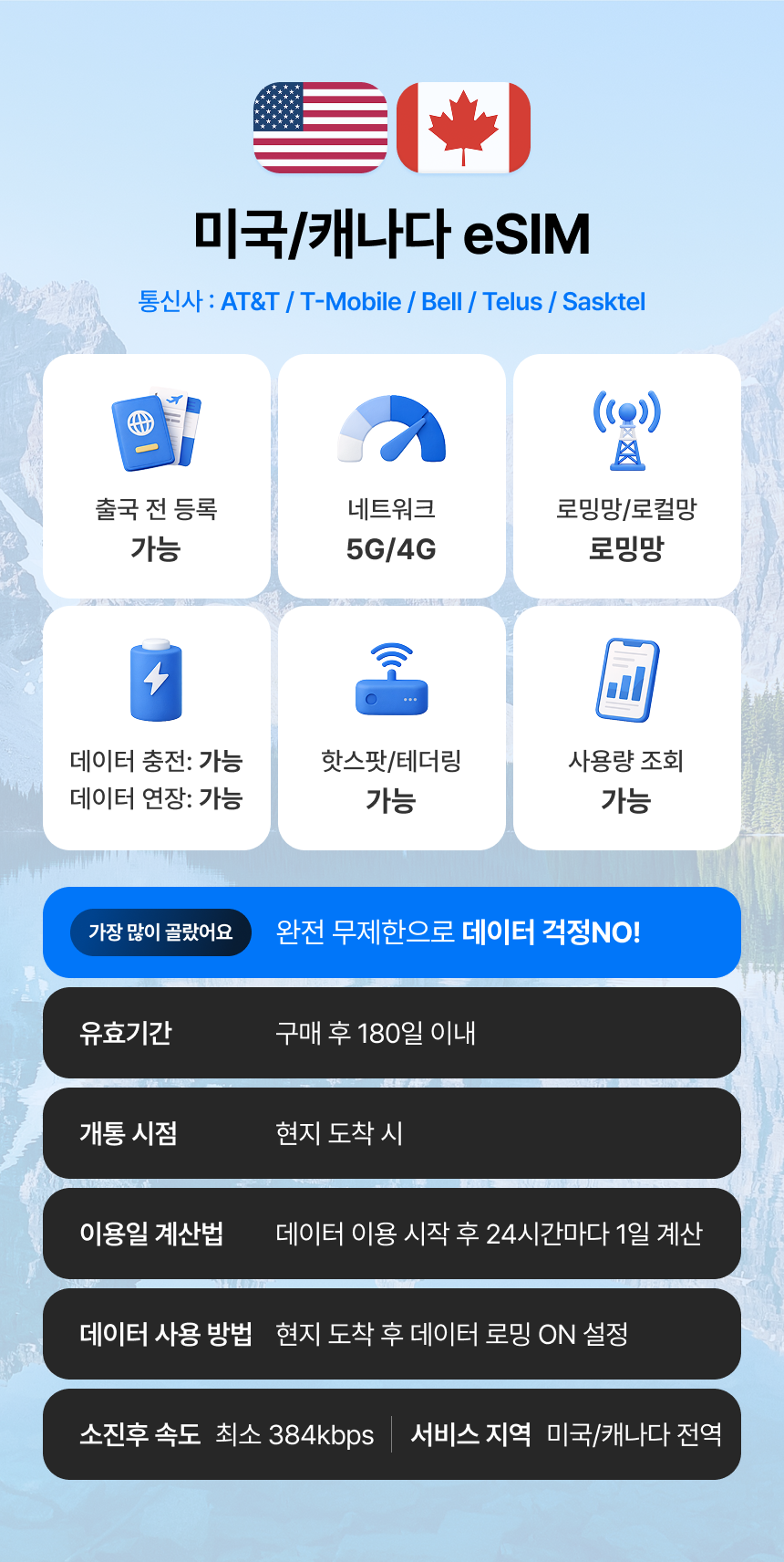 [10%할인] [완전 무제한] 미국 / 캐나다 eSIM 이심