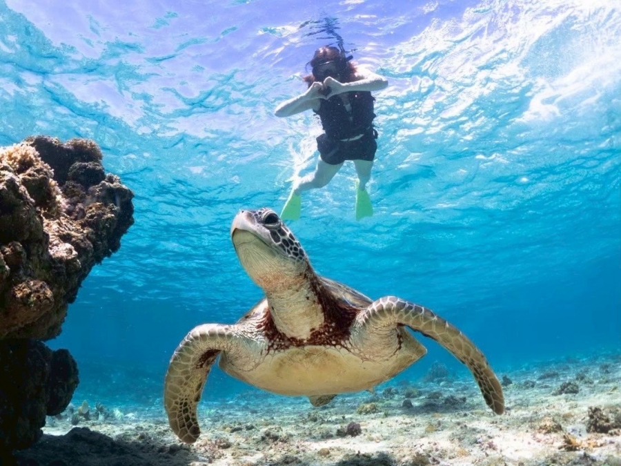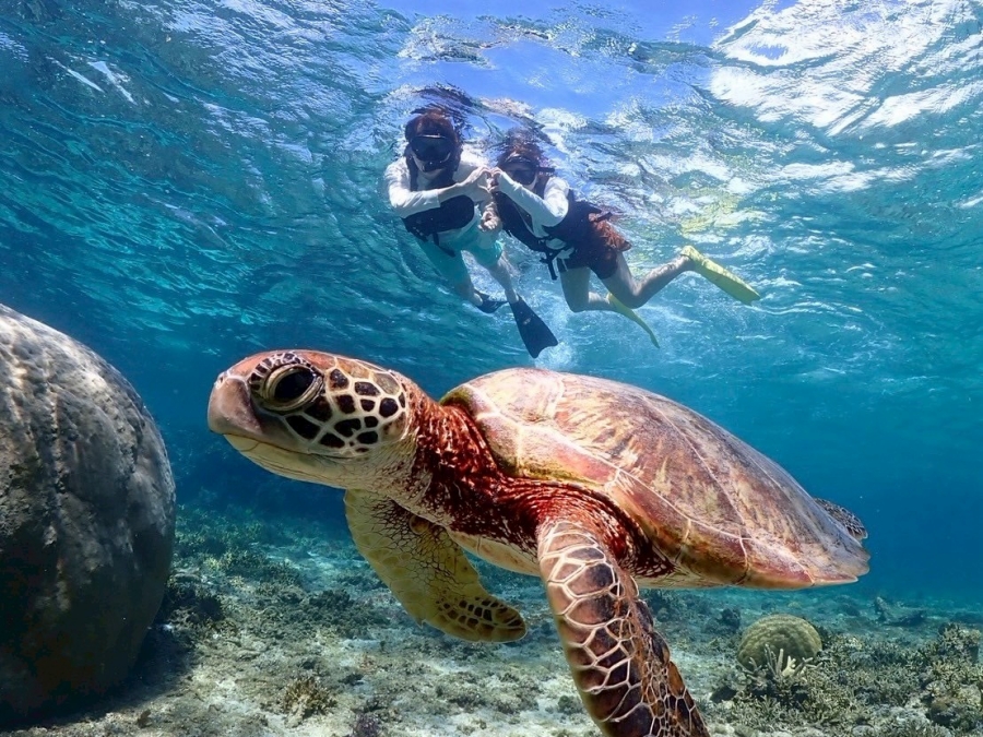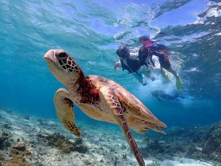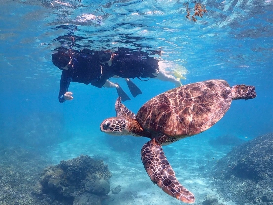 미야코지마의 맑고 투명한 바다에서 바다거북과 함께 수영하며 산호초 군락을 가까이에서 감상할 수 있는 스노클링 투어를 소개해요.