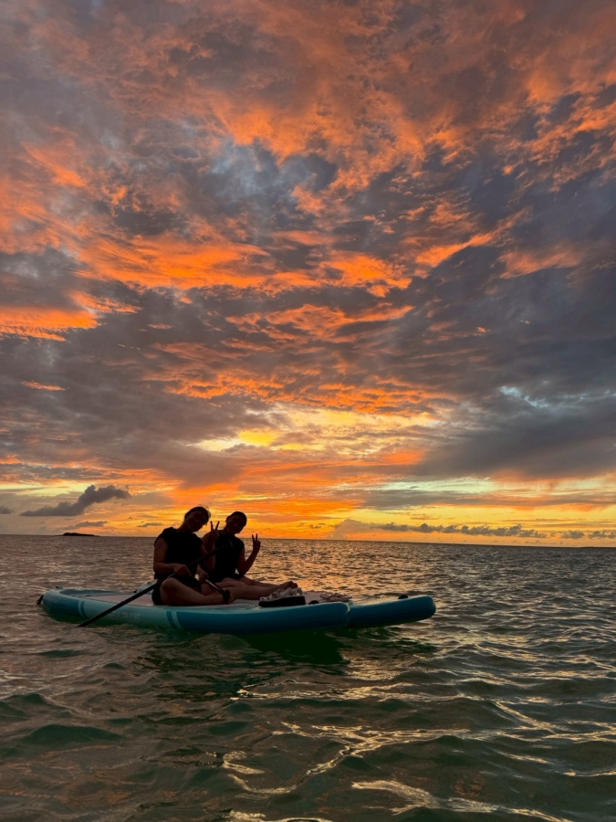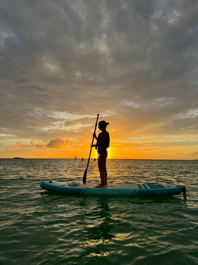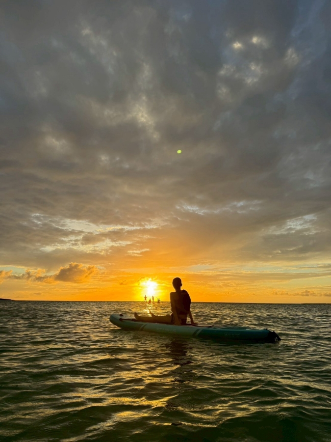 미야코지마의 아름다운 선셋을 배경으로 보드 위에서 여유롭게 바다를 만끽해요