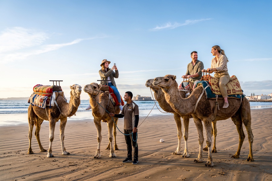 해안 사구를 가로지르는 낭만적인 낙타 라이딩