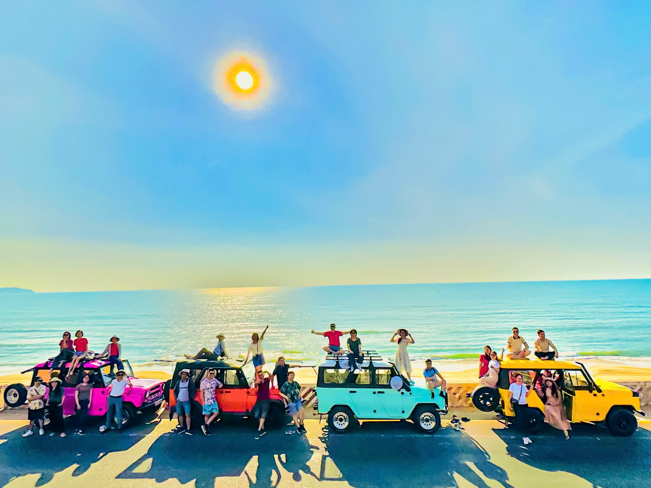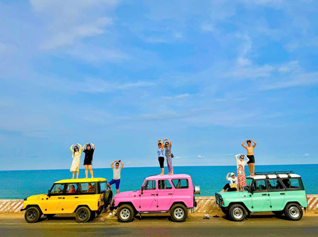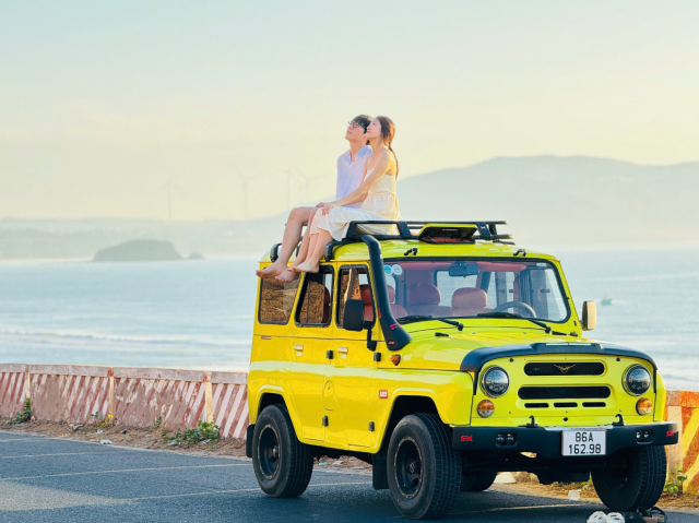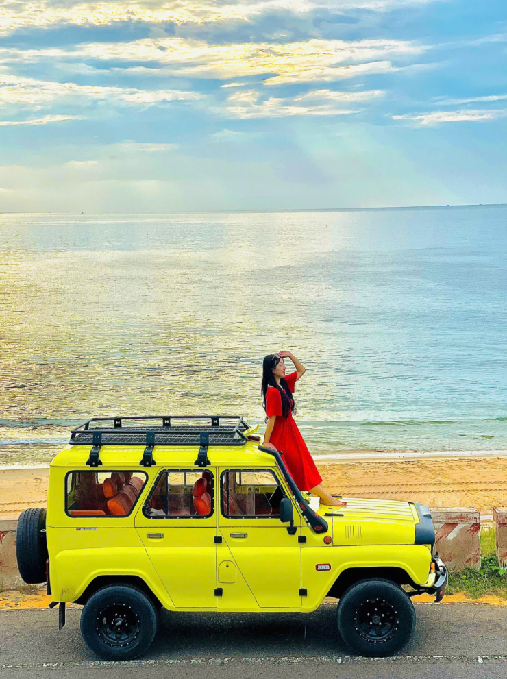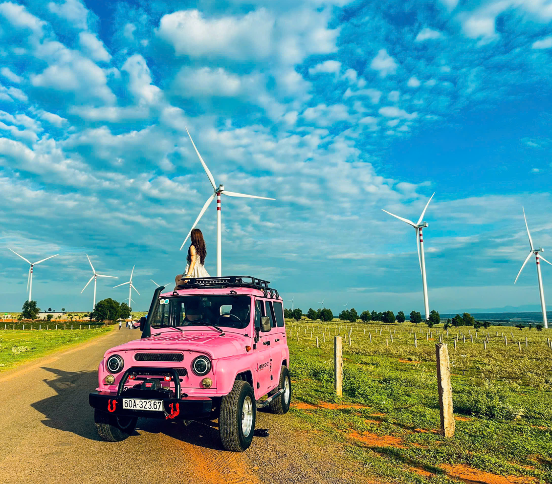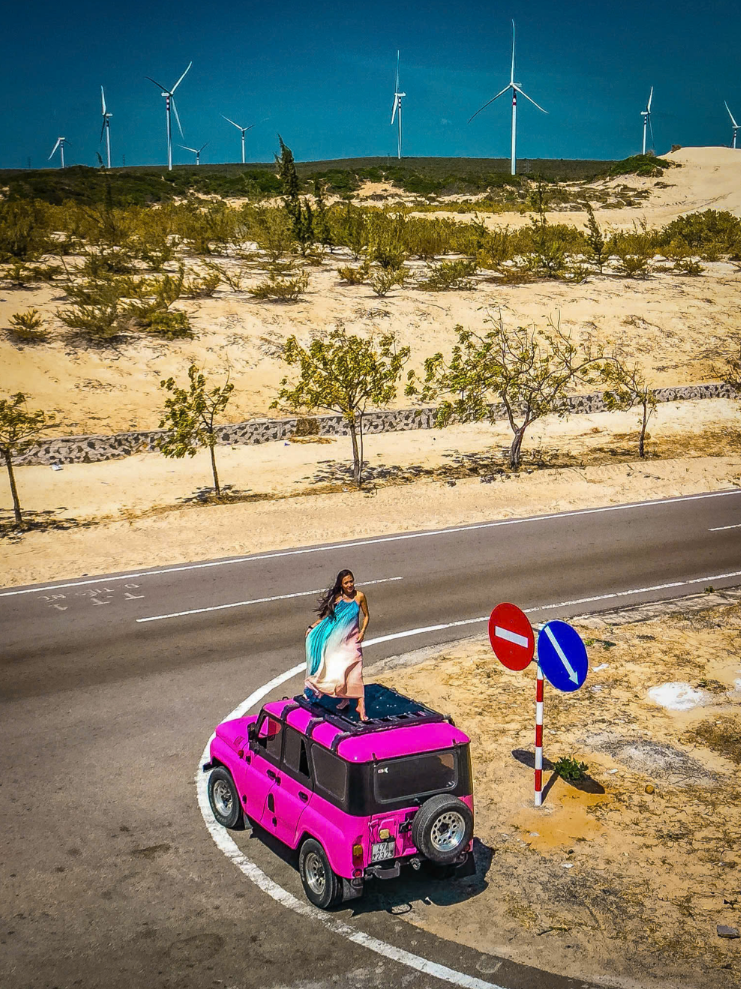 거대한 풍력 발전기가 돌아가는 해안 도로를 달리는 기분은 무이네 투어의 숨은 하이라이트입니다. 이국적인 풍경을 배경으로 지프차 위에 올라타 멋진 포즈를 취해보세요.