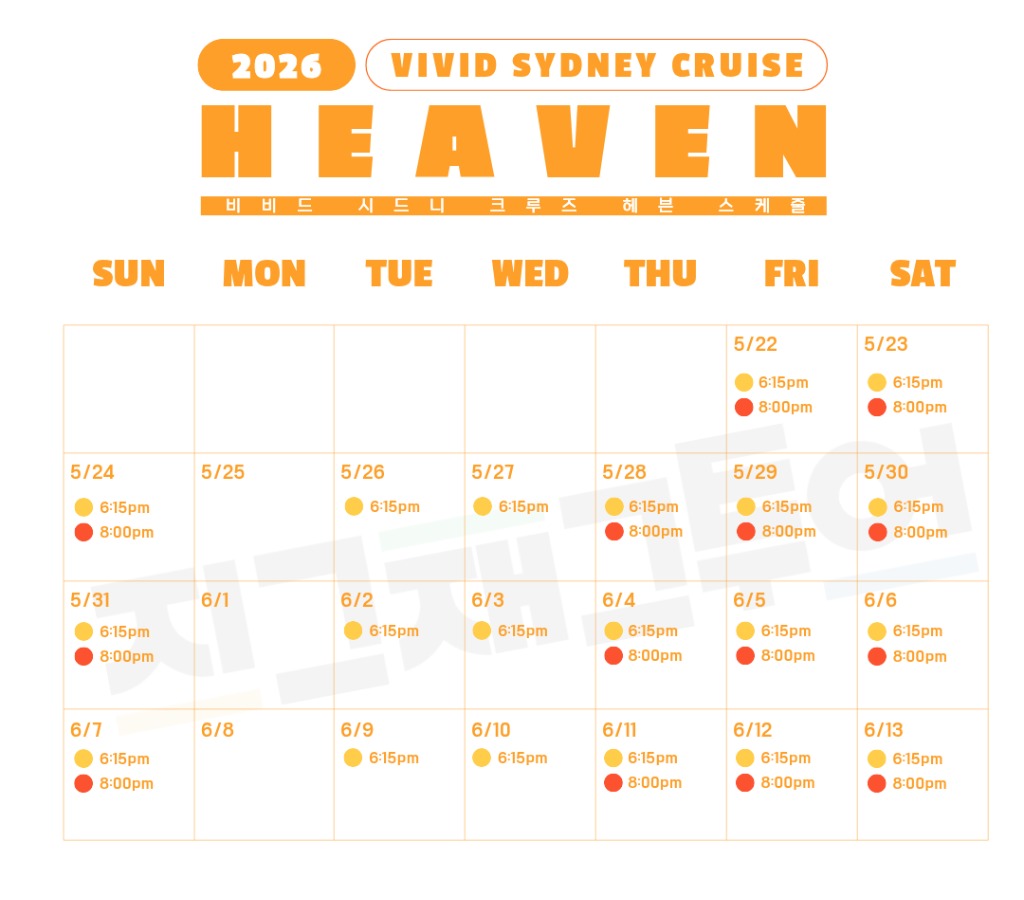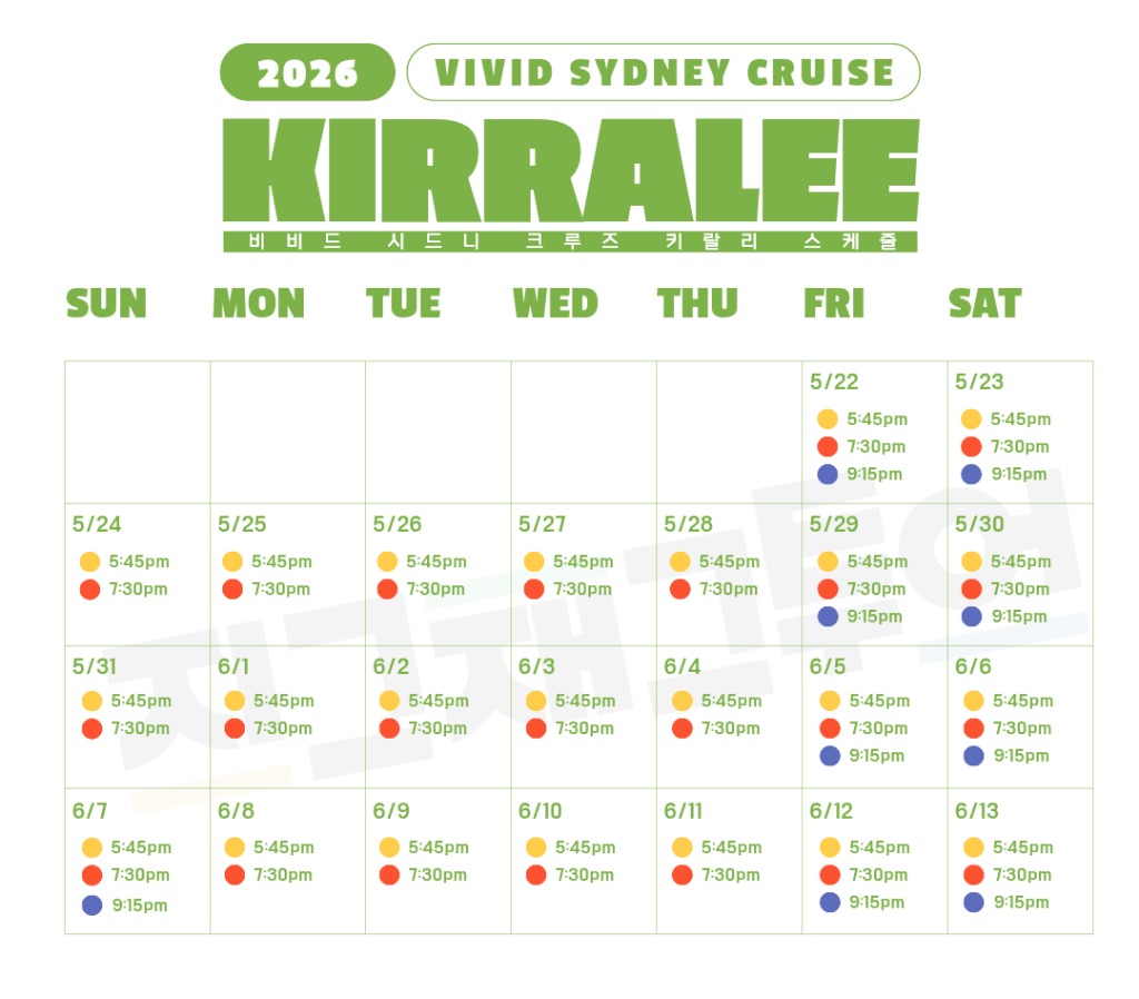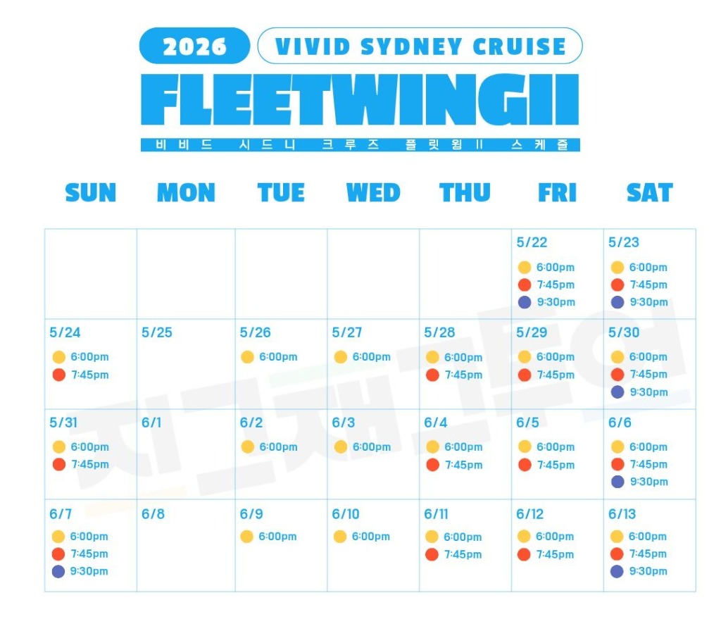 축제 기간에 맞춰 특별히 운영되는 이번 크루즈는 단순히 이동하는 수단이 아닌, 그 자체로 하나의 완벽한 여행 콘텐츠입니다. 전문 크루들의 친절한 응대와 함께 가벼운 다과를 곁들이며 시드니 시티의 스카이라인을 감상할 수 있습니다. 5월 22일부터 6월 13일까지 한정된 기간 동안만 운영되는 이 특별한 항해를 통해 세계적인 조명 축제의 하이라이트를 가장 가까운 거리에서 마주해 보시기 바랍니다.