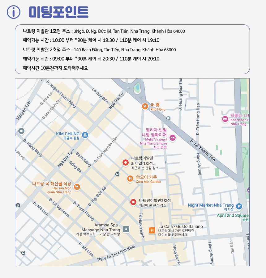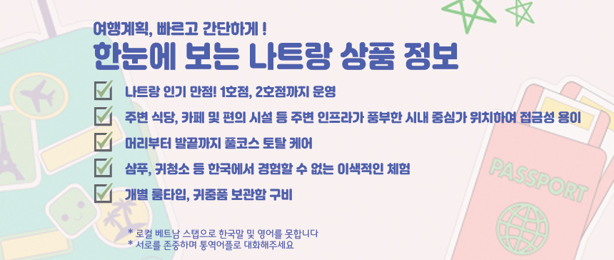 푸른 바다와 활기찬 시내를 즐긴 뒤, 나트랑 이발관에서 지친 몸을 정돈해 보세요. 시내 중심인 1호점(안토이 옆)과 2호점(CCCP 커피 앞)은 뛰어난 접근성을 자랑하며, 단순한 미용을 넘어 머리부터 발끝까지 관리받는 '토탈 케어'의 즐거움을 선사합니다.