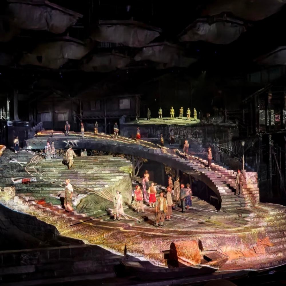 최첨단 음향과 조명, 그리고 실제 크기의 조형물들이 무대 곳곳에서 튀어나옵니다. 충칭의 가파른 계단과 골목, 안개 낀 부두의 모습이 정교하게 재현되어 마치 1949년의 충칭 시내 한복판에 서 있는 듯한 착각을 불러일으킵니다.