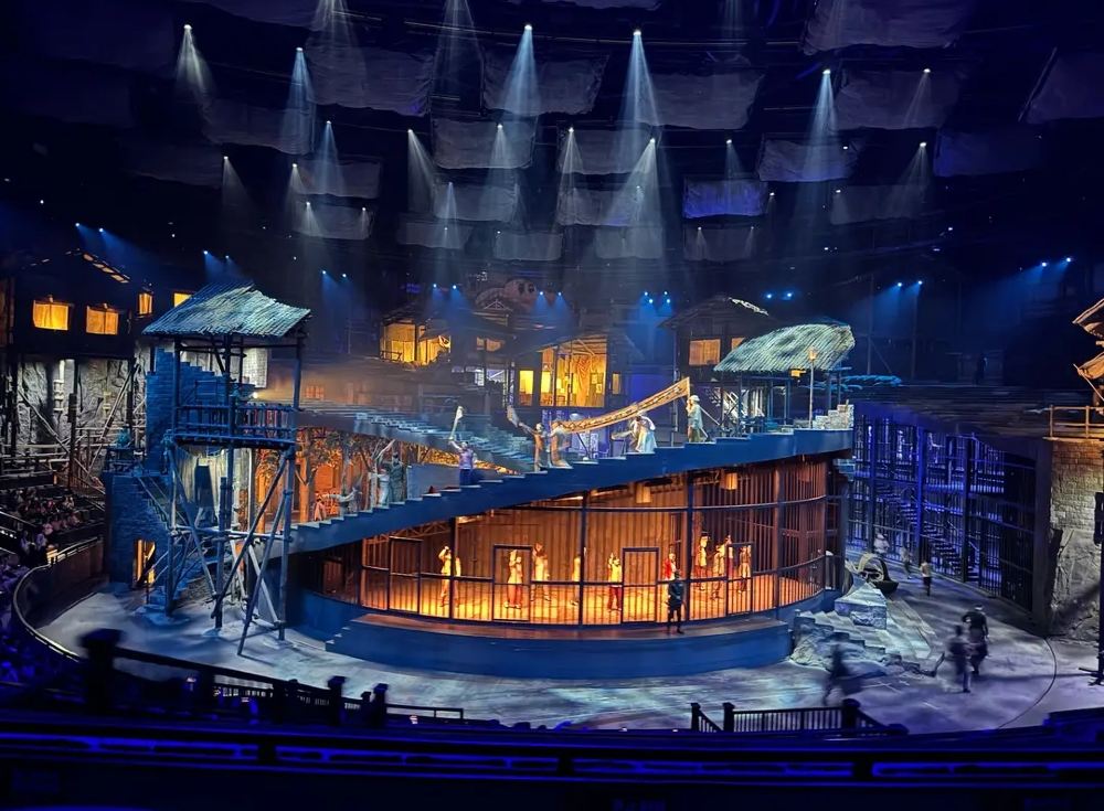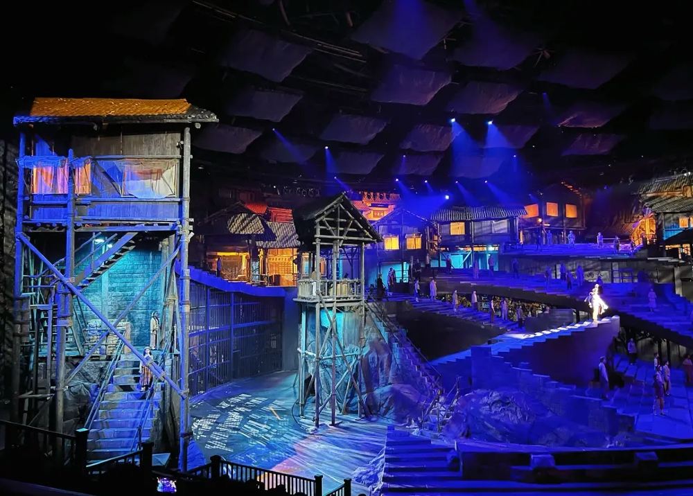 이 공연의 백미는 단연 360도 회전하는 객석과 무대입니다. 관객은 가만히 앉아 있는 것이 아니라, 장면의 흐름에 따라 객석이 이동하고 무대가 층층이 변모하며 극 속으로 빨려 들어가는 듯한 '몰입형 경험'을 하게 됩니다. 거대한 전함이 등장하고 쏟아지는 폭포수와 실제 같은 폭발 장면 등은 오직 충칭 1949 대극장에서만 만날 수 있는 압도적인 스케일의 향연입니다.
