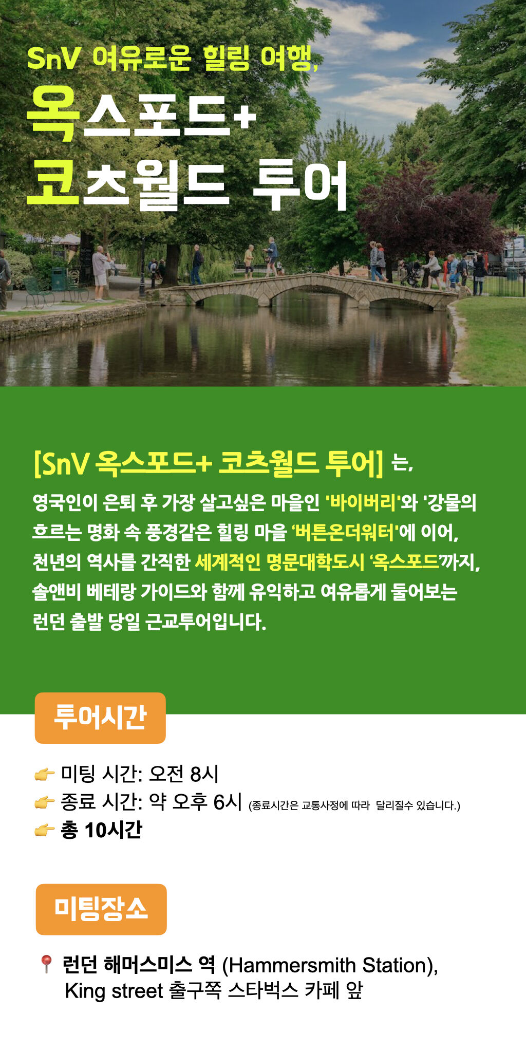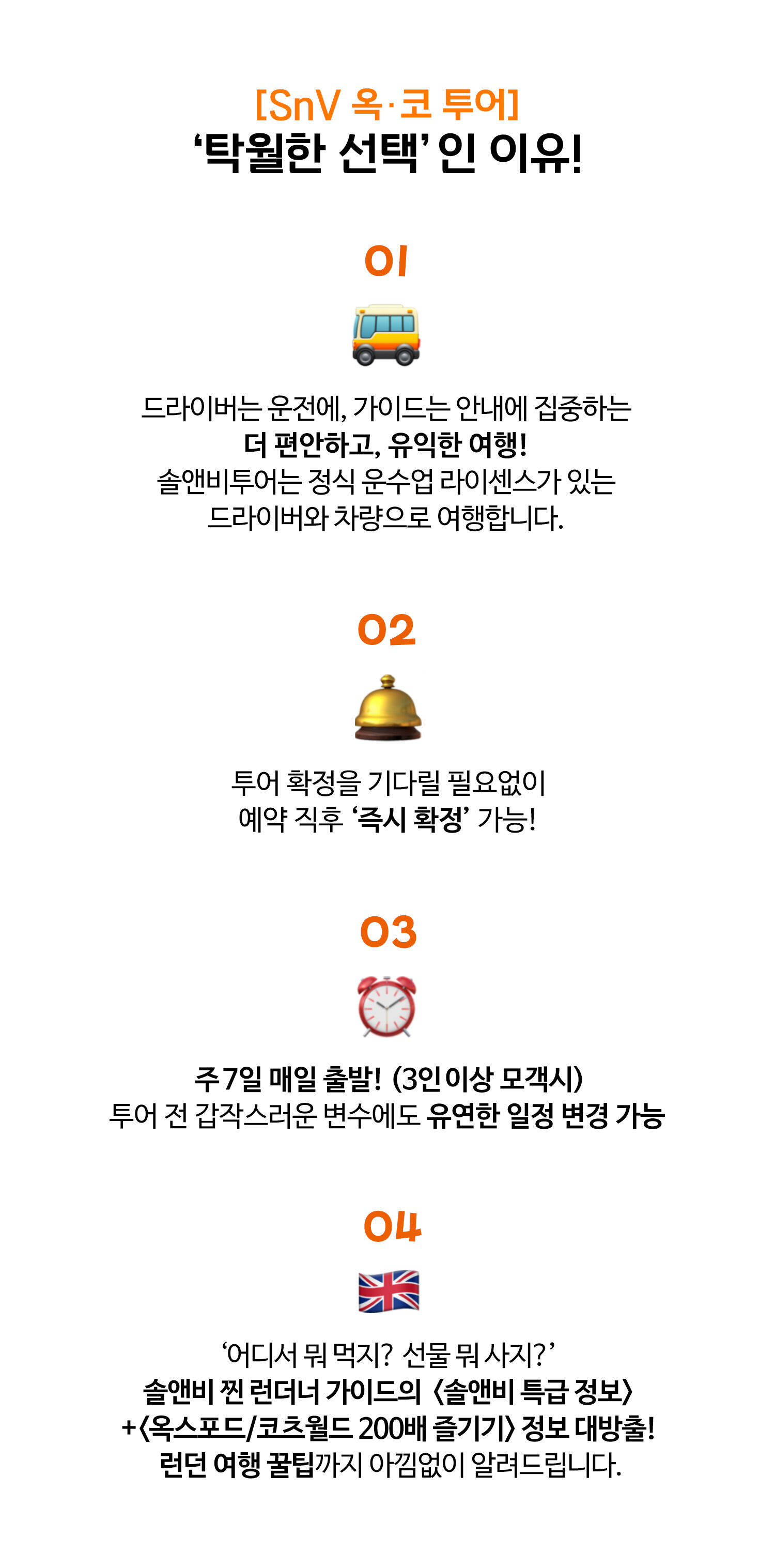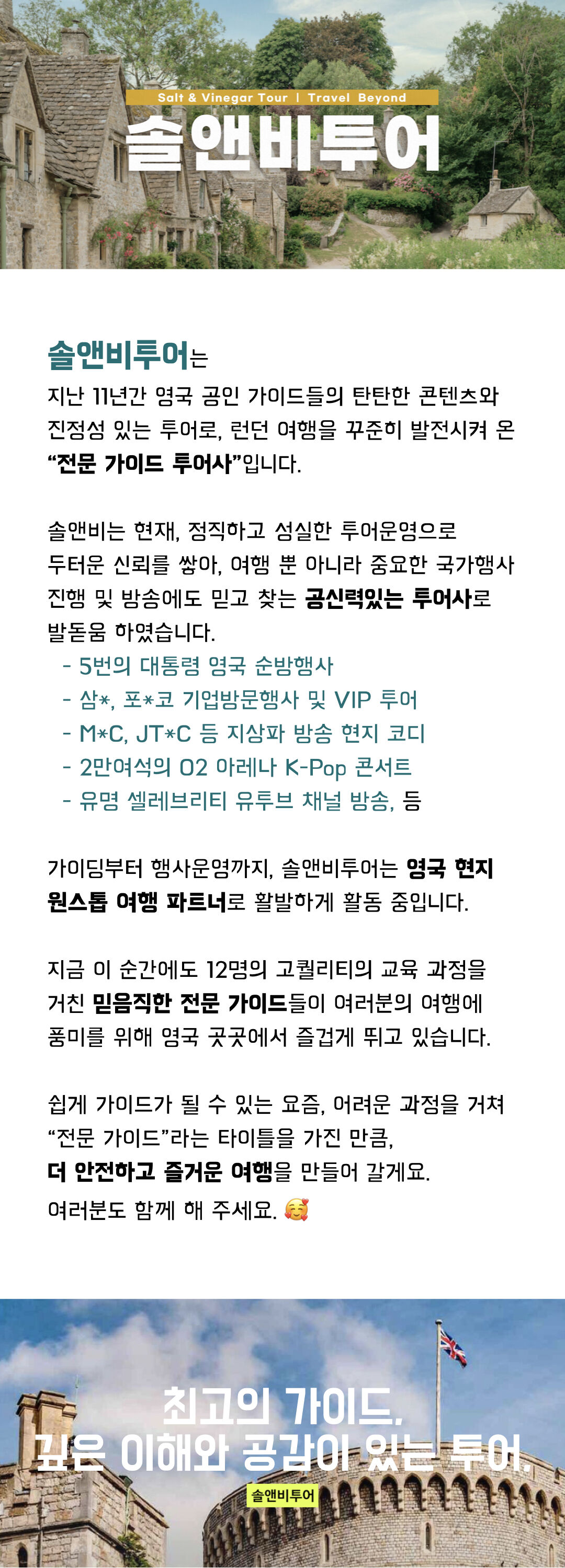강물이 흐르는 명화 속 풍경을 그대로 옮겨놓은 듯한 ‘버튼 온더 워터’에서는 흐르는 물소리에 마음을 맡기고, 이어지는 천년 역사의 성지 ‘옥스포드’에서 세계적인 석학들의 발자취를 따라가 봅니다. 베테랑 가이드가 들려주는 깊이 있는 이야기와 함께라면, 단순히 보는 여행을 넘어 영국의 역사와 문화를 가슴 깊이 새기는 유익한 시간이 될 것입니다. 런던에서 출발하는 가장 여유롭고 따뜻한 하루, 당신의 영국 여행에 잊지 못할 페이지를 장식해 드립니다.