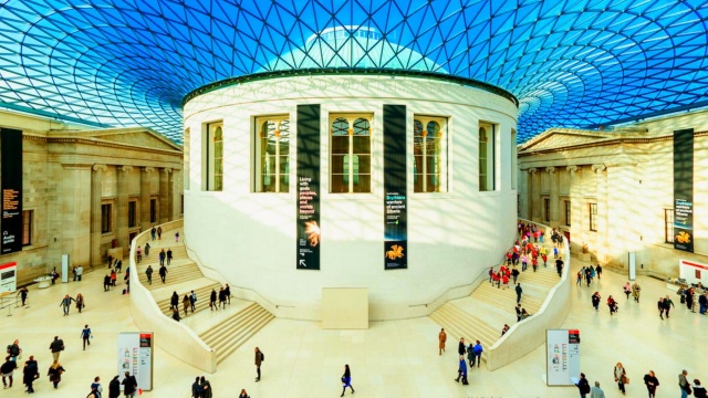 투어의 중간, 노먼 포스터가 설계한 유럽 최대의 실내 광장 '그레이트 코트'에서 잠시 숨을 고릅니다. 기하학적인 유리 지붕 사이로 쏟아지는 눈부신 햇살 아래서 고전 건축과 현대 디자인이 조화를 이루는 비현실적인 풍경을 감상해 보세요.