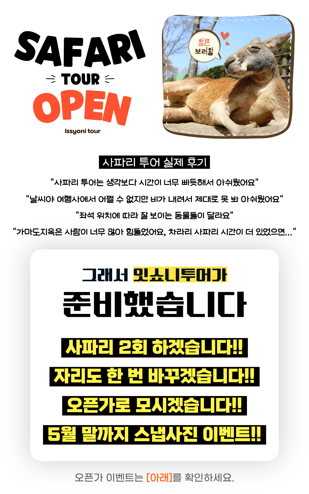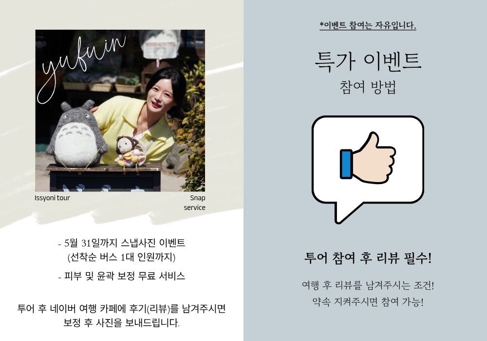 온천과 자연이 어우러진 유후인에서 여유로운 산책과 자유 시간을 즐긴 뒤, 대규모 사파리에서 다양한 동물을 가까이에서 관찰하고 교감할 수 있어요. 이동은 전용 차량으로 편안하게 진행되며 한국어 가이드가 동행해 여행 내내 상세한 설명과 안내를 제공해요. 또한 스냅샷 서비스가 포함되어 있어 여행의 순간을 사진으로 남기며 특별한 하루를 더욱 생생하게 기록할 수 있어요.
