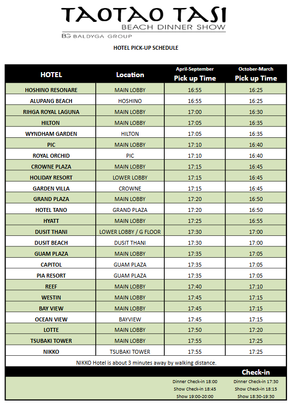 괌 타오타오타씨 공연장은 괌에서 가장 예쁜 석양을 볼 수 있는 곳으로 유명한 더 비치 바에서 진행돼요. 더 비치 바는 투몬비치에 위치해 있으며, 괌 도심에서 북쪽에 위치해 있어 픽업 서비스를 이용하면 더 편하게 이동할 수 있어요. 시간에 맞춰 호텔 로비에 있으면 더 비치 바의 셔틀버스가 픽업을 해준답니다.