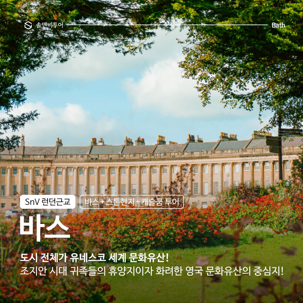 런던 여행 중이라면 꼭 가봐야 할 근교 여행지! 바스와 스톤헨지 그리고 캐슬쿰을 편하게 한국인 가이드와 함께 여행하세요. 먼저 고풍스러운 도시 바스는 영국의 역사를 고스란히 담고 있어요. '로만 바스'를 비롯한 무려 2000년 전의 유적들이 남아있는 곳이죠. 거기에 지금으로부터 300년 전에는 영국 귀족들의 대표 휴양지가 되었던 곳이라, 영국에서 가장 아름다운 도시 풍경을 갖추게 되었답니다. 영화 '오만과 편견'의 촬영지로도 정말 유명한 곳이에요.