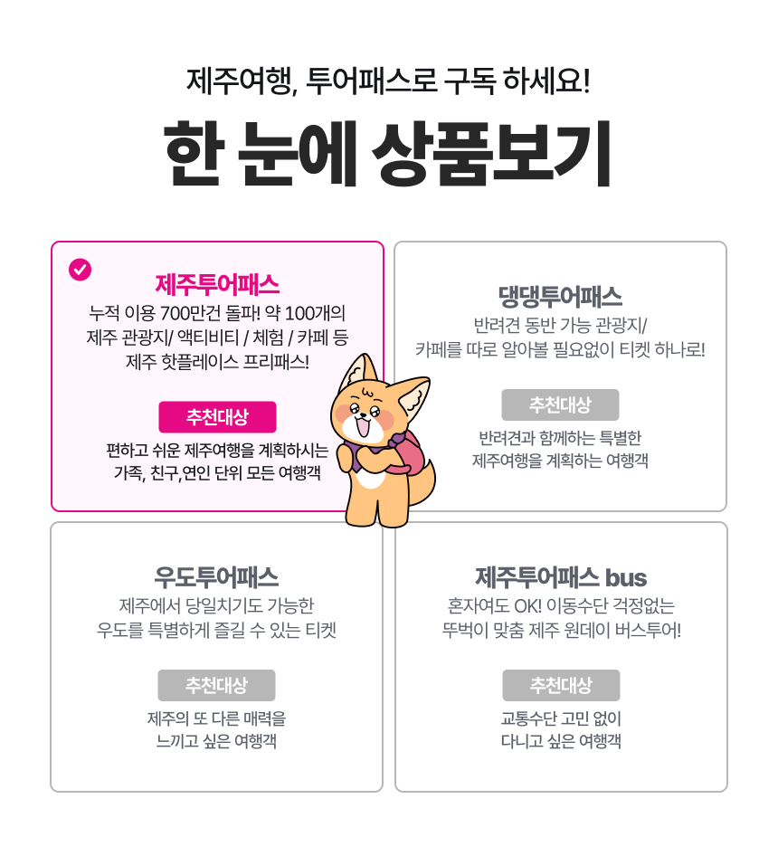 반려견과 함께라면 댕댕투어패스를, 선택형 자유이용권을 원한다면 타임제로 자유이용권을 확인해보세요.
