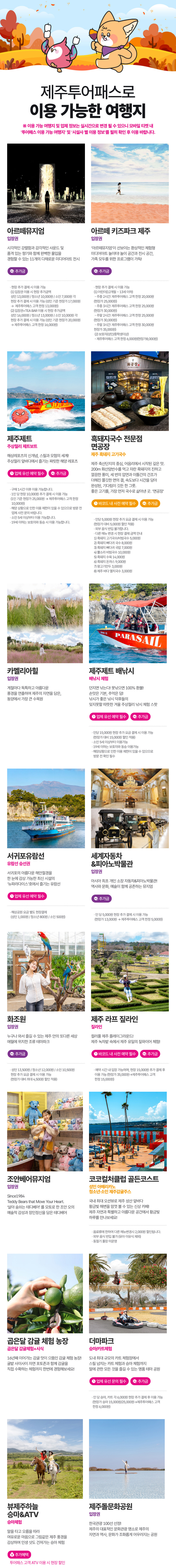 갈 곳은 많고 사야하는 입장권이 많을때! 48시간 프리 제주투어패스를 이용해보세요. 역대급 제주도 상품으로 필수로 챙겨야할 모든 명소를 포함한 티켓이에요. 이용 가능 여행지는 실시간으로 변경 될 수 있으니 모바일 티켓의 '투어패스 이용가능 여행지'만 확인하면 어디든 무료 입장할 수 있어요!
