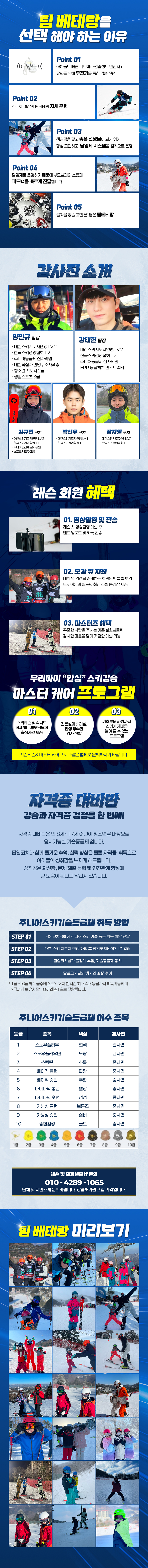 용평리조트 슬로프 위에서 실력으로 증명된 코치진에게 직접 배우는 팀베테랑 스키·보드 강습이에요. 레벨과 연령에 관계없이 개인 맞춤 피드백으로 진행되어 처음 강습을 받는 분부터 실력 향상을 원하는 라이더까지 모두 만족할 수 있어요. 🎿❄️