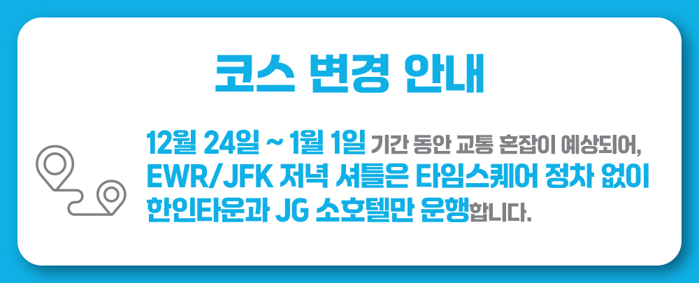 맨해튼 시내에서 공항으로 가는 여행자분들을 위해, 신속하고 안전한 셔틀 서비스를 소개해요. 빠르고 효율적인 이동으로 피로 없이 공항에 도착할 수 있어요. 국적 항공사 승무원 셔틀 업체로서 안전하고 체계적인 운행, 유동적인 일정 조정을 통해 여러분의 공항 이동을 더욱 특별하고 편리하게 만들어드릴 거예요. 맨해튼 소호텔, 한인타운 던킨도넛, 타임스퀘어 중 원하시는 하차 장소에서 편안하게 탑승하시고, 공항까지 여유롭게 도착하세요!