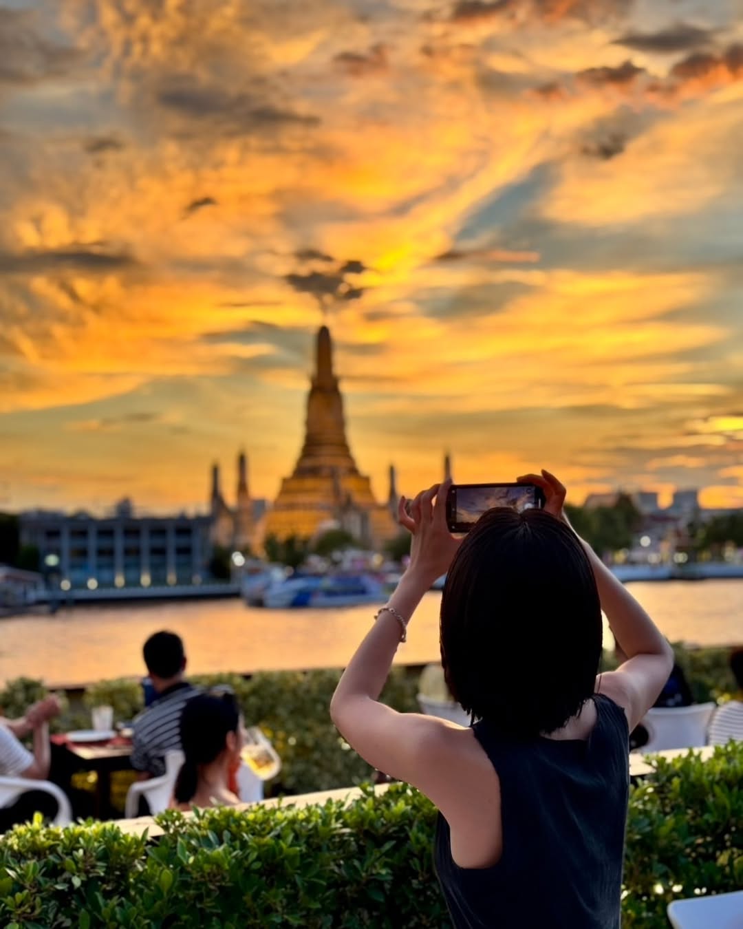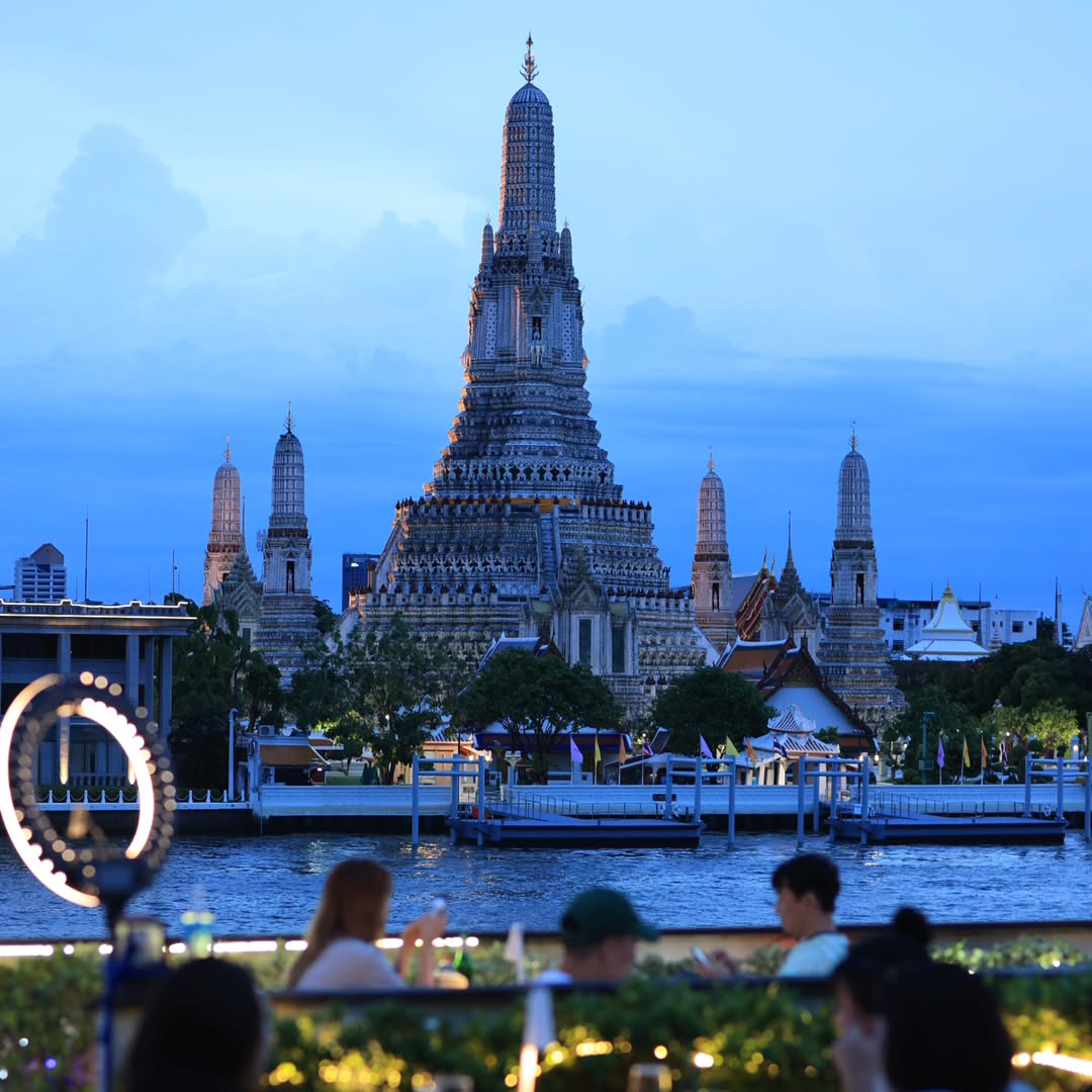 촘아룬 레스토랑의 가장 큰 매력은 바로 압도적인 '뷰'입니다. 해가 지기 시작하면 왓 아룬의 황금색과 흰색 탑이 조명과 어우러져 강물에 비치는데, 이 환상적인 장면을 레스토랑의 루프탑 또는 리버사이드 좌석에서 정면으로 감상할 수 있습니다. 특히 해가 완전히 넘어간 후 왓 아룬의 조명이 가장 밝게 빛나는 순간은 방콕에서 경험할 수 있는 최고의 낭만적인 순간으로 평가됩니다.