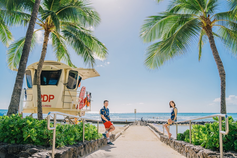 하와이 하면 떠오르는 상징적인 핑크색 호텔인 로열 하와이안 호텔을 배경으로 한 로맨틱한 씬과 활기찬 와이키키 거리를 걷는 화보 같은 컷을 동시에 남길 수 있으며, 2026년 현재는 이른 아침의 정적인 바다와 노을이 지는 매직 아워 타임이 가장 선호됩니다. 특히 와그(WAUG)에서 예약 가능한 스냅 투어를 이용하면 촬영이 처음인 커플들도 부담 없이 1~2시간 내에 핵심 스팟에서 인생 사진을 완성할 수 있습니다.