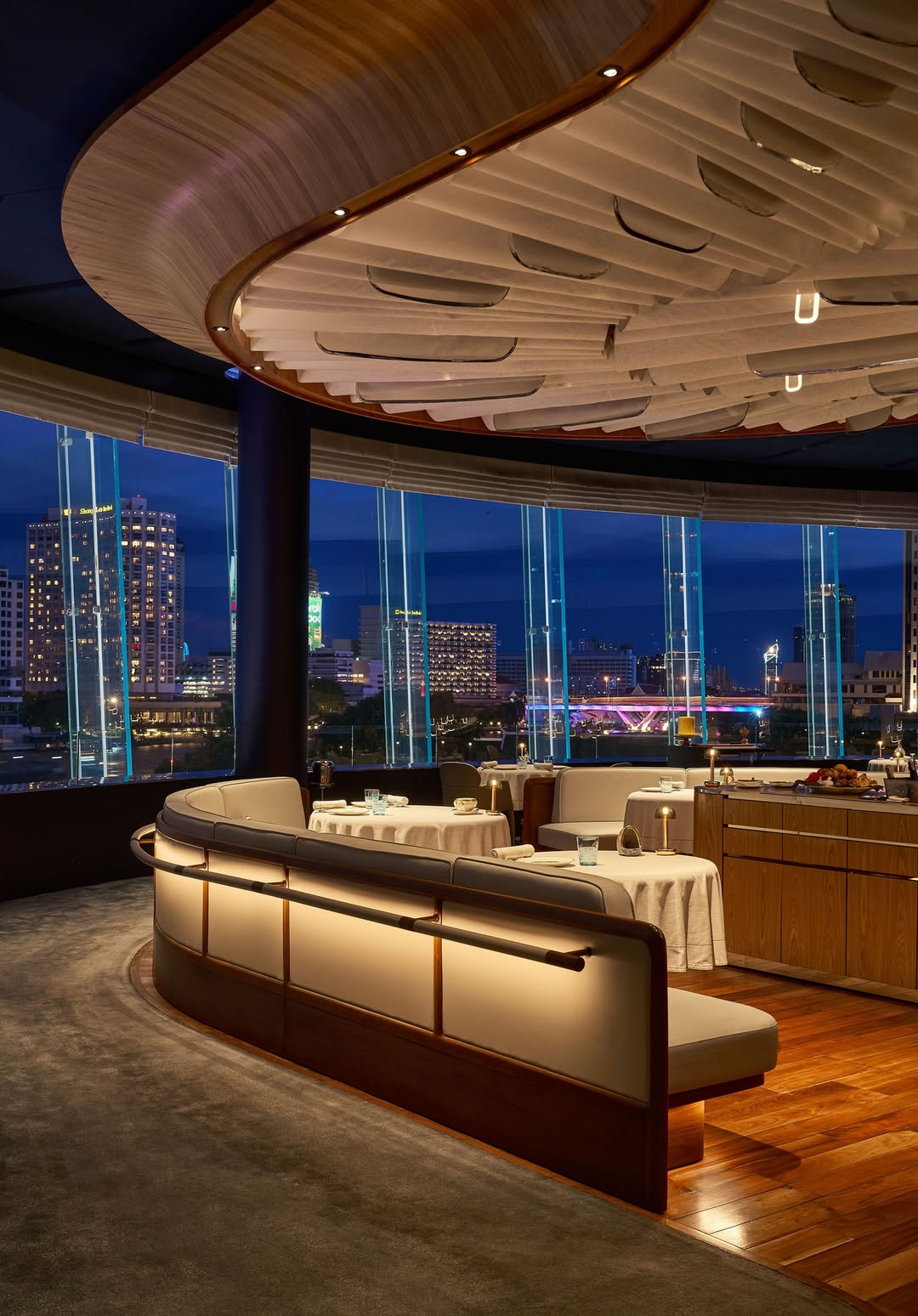 조금 더 특별하고 럭셔리한 경험을 원하신다면 아이콘시암 내부에 위치한 블루 바이 알랭 뒤카스(Blue by Alain Ducasse)를 추천합니다. 세계적인 셰프 알랭 뒤카스의 지휘 아래 운영되는 이곳은 통유리창을 통해 차오프라야 강의 역동적인 모습과 반대편 도심의 스카이라인을 감상하며 최고급 프랑스 요리를 맛볼 수 있는 곳입니다. 2026년 현재 방콕에서 가장 세련된 미식 경험을 제공하는 곳으로 평가받습니다.