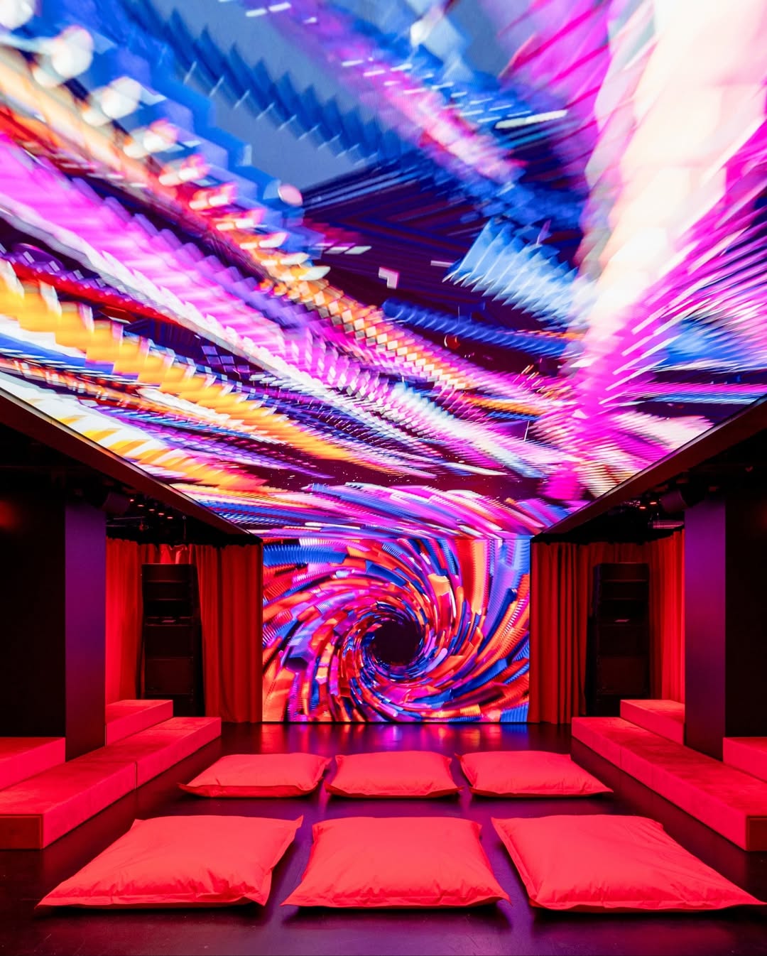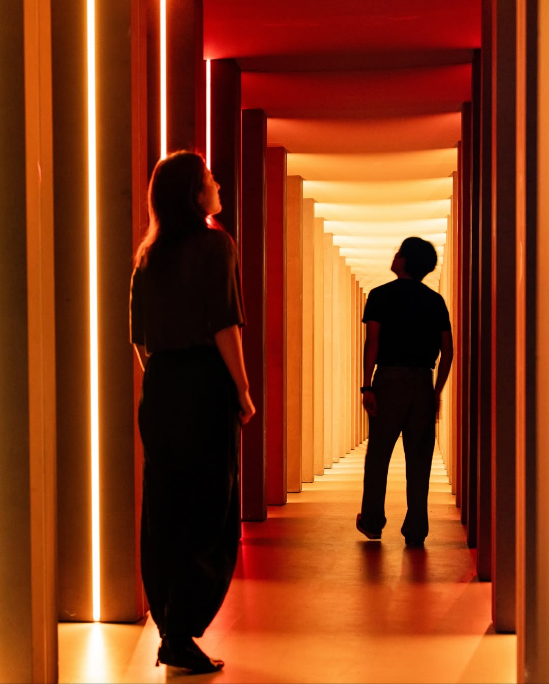 LED 조명이 통로를 감싸며 시시각각 색이 변하는 빛의 복도입니다. 거울을 이용한 무한한 공간감 속에서 빛의 건축물을 걷는 듯한 몽환적인 경험을 할 수 있습니다.