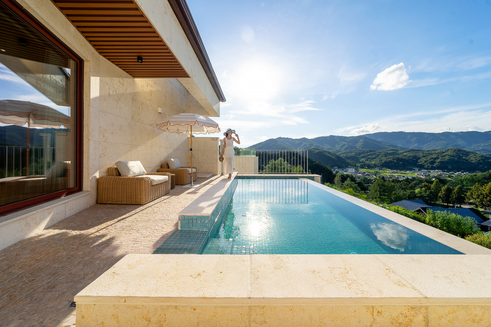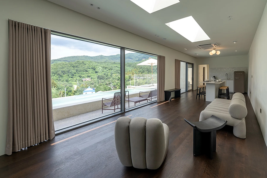 므흐뽀제에서의 하루는 단순한 숙박을 넘어 시각과 촉각을 깨우는 예술적인 경험으로 채워집니다. 전면 통창을 통해 계절마다 다른 수채화를 그려내는 숲의 풍경은 거실에 앉아있는 것만으로도 압도적인 해방감을 선사합니다. 특히 이곳의 백미는 자연을 바라보며 즐길 수 있는 프라이빗한 수영장과 야외 테라스입니다. 시원하게 펼쳐진 숲을 배경으로 물놀이를 즐기거나, 해 질 녘 테라스에서 즐기는 와인 한 잔은 유럽의 고급 휴양지 부럽지 않은 럭셔리한 무드를 완성합니다.