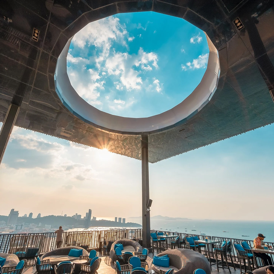 파타야에는 수많은 루프탑 바가 존재하지만, 힐튼 파타야의 '호라이즌'이 가진 독보적인 위상은 변함이 없습니다. 이곳은 단순히 높은 곳에서의 조망을 넘어 감각적인 건축 미학과 최고급 다이닝이 결합된 복합 문화 공간이기 때문이에요. 34층 엘리베이터 문이 열리는 순간 마주하는 탁 트인 수평선과 세련된 네온 조명은 여행자의 가슴을 설레게 하기에 충분합니다. 특히 바다를 향해 돌출된 테라스 좌석은 마치 공중에 떠 있는 듯한 짜릿한 개방감을 선사하며, 파타야에서 가장 럭셔리한 밤을 약속합니다.