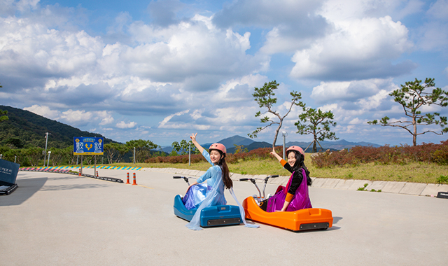 강화 씨사이드 루지는 연장 1.8km/line, 총 2코스(오션코스, 밸리코스)로 구성된 아시아 최대 규모를 자랑합니다. 특별한 동력장치 없이 오직 트랙의 경사와 중력만을 이용해 내려오는 특수 제작 카트는 땅에 밀착되어 달리는 만큼 실제 속도보다 훨씬 다이나믹한 스피드감을 선사합니다. 조작법이 간단해 남녀노소 누구나 안전하고 짜릿하게 즐길 수 있는 것이 특징입니다.