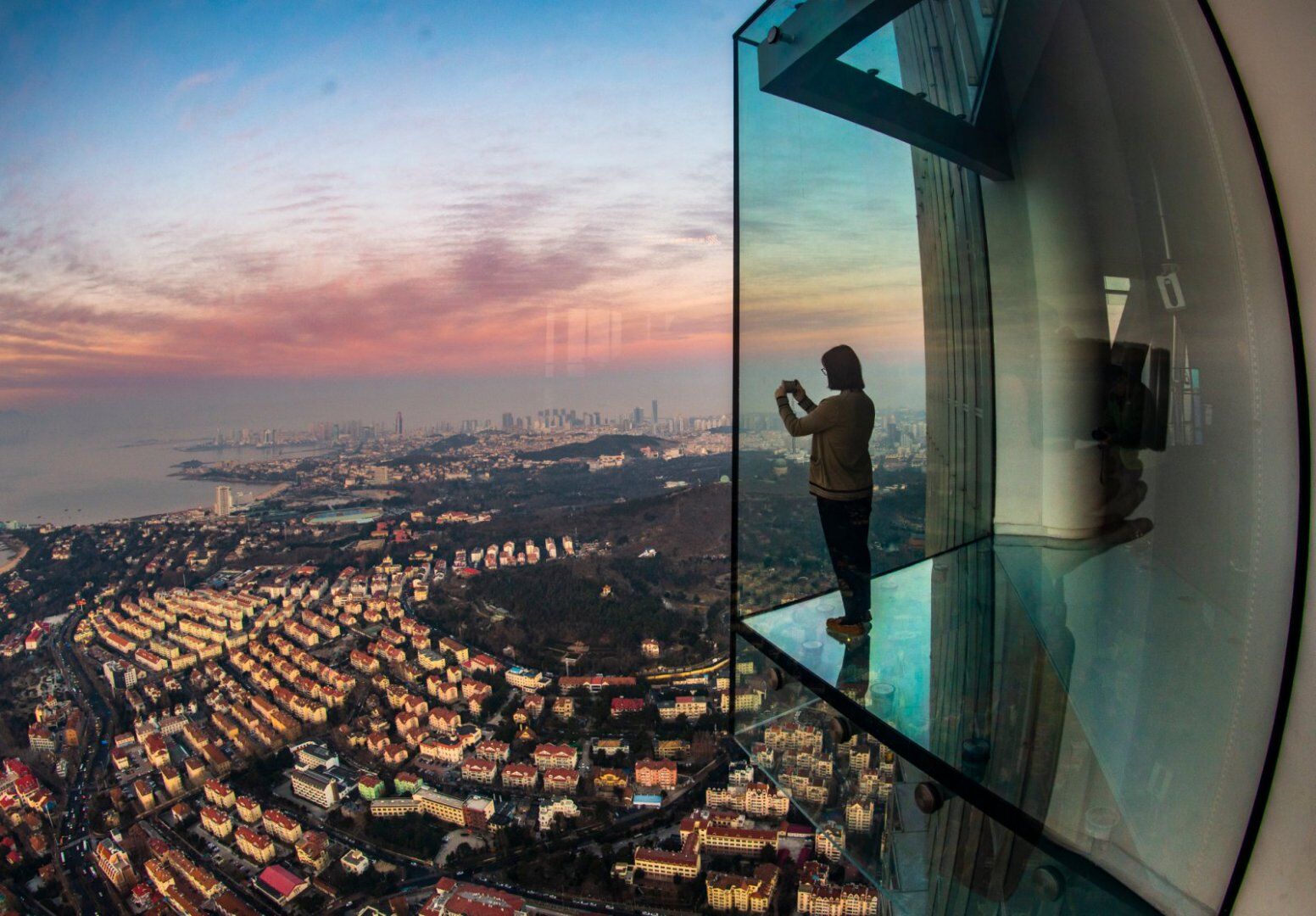 운상해천의 하이라이트는 단연 허공에 떠 있는 듯한 기분을 만끽할 수 있는 투명 유리 구간입니다. 발아래가 훤히 내려다보이는 강화유리 위에 서면, 300m 아래의 도심 빌딩들이 장난감처럼 보이며 짜릿한 전율을 선사합니다. 이곳은 칭다오에서 가장 핫한 '인생 사진' 성지로도 유명한데요. 특히 노을이 지는 골든 아워에 방문하면 온 세상이 붉게 물드는 드라마틱한 배경과 함께 몽환적인 사진을 남길 수 있습니다.